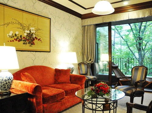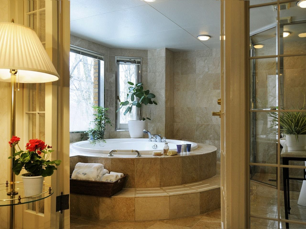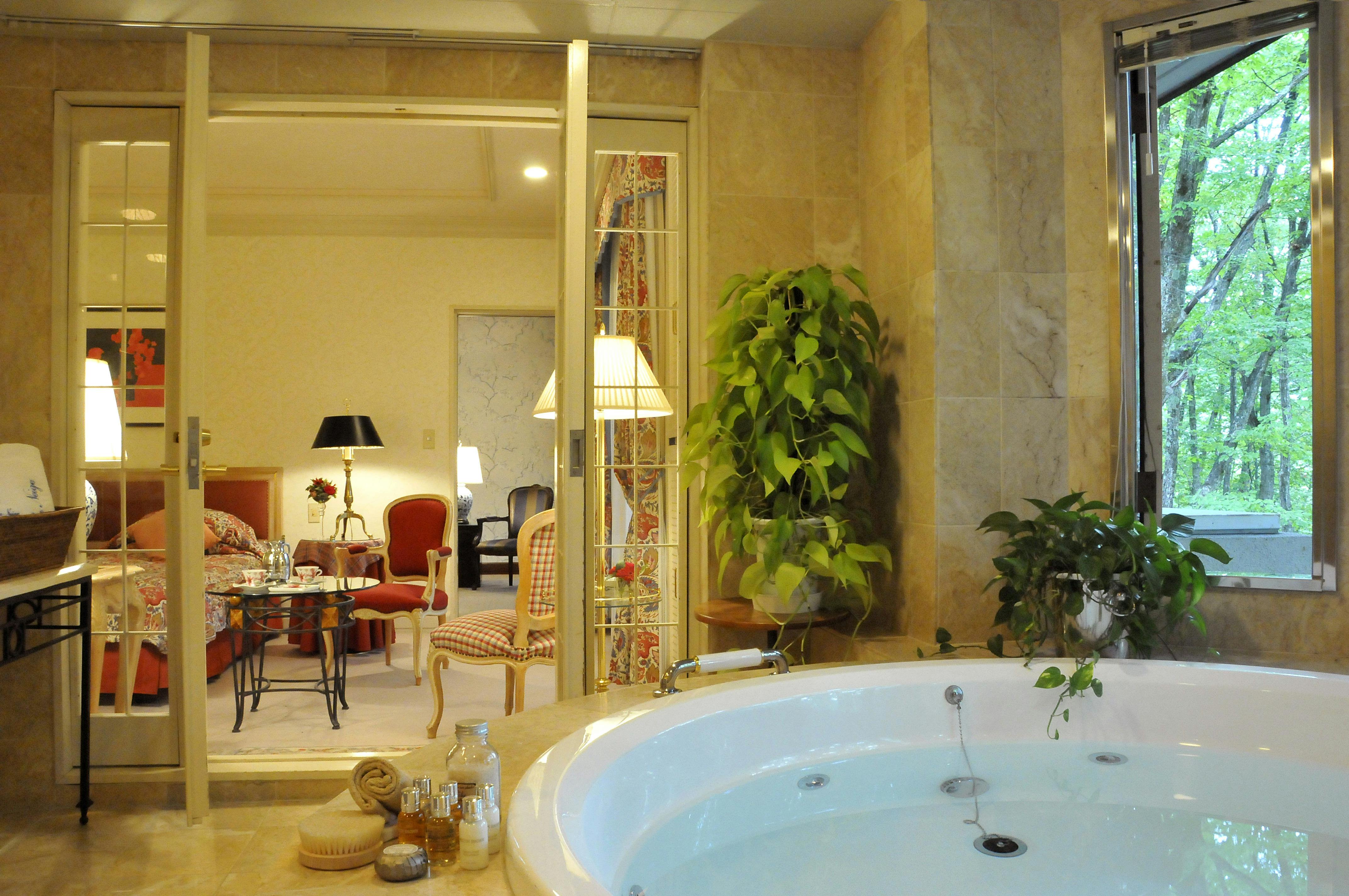 全室異なるデザインのお部屋には大きなジャグジーバスが備えられております。デラックスルームで四季の移ろいと静寂をお愉しみください。