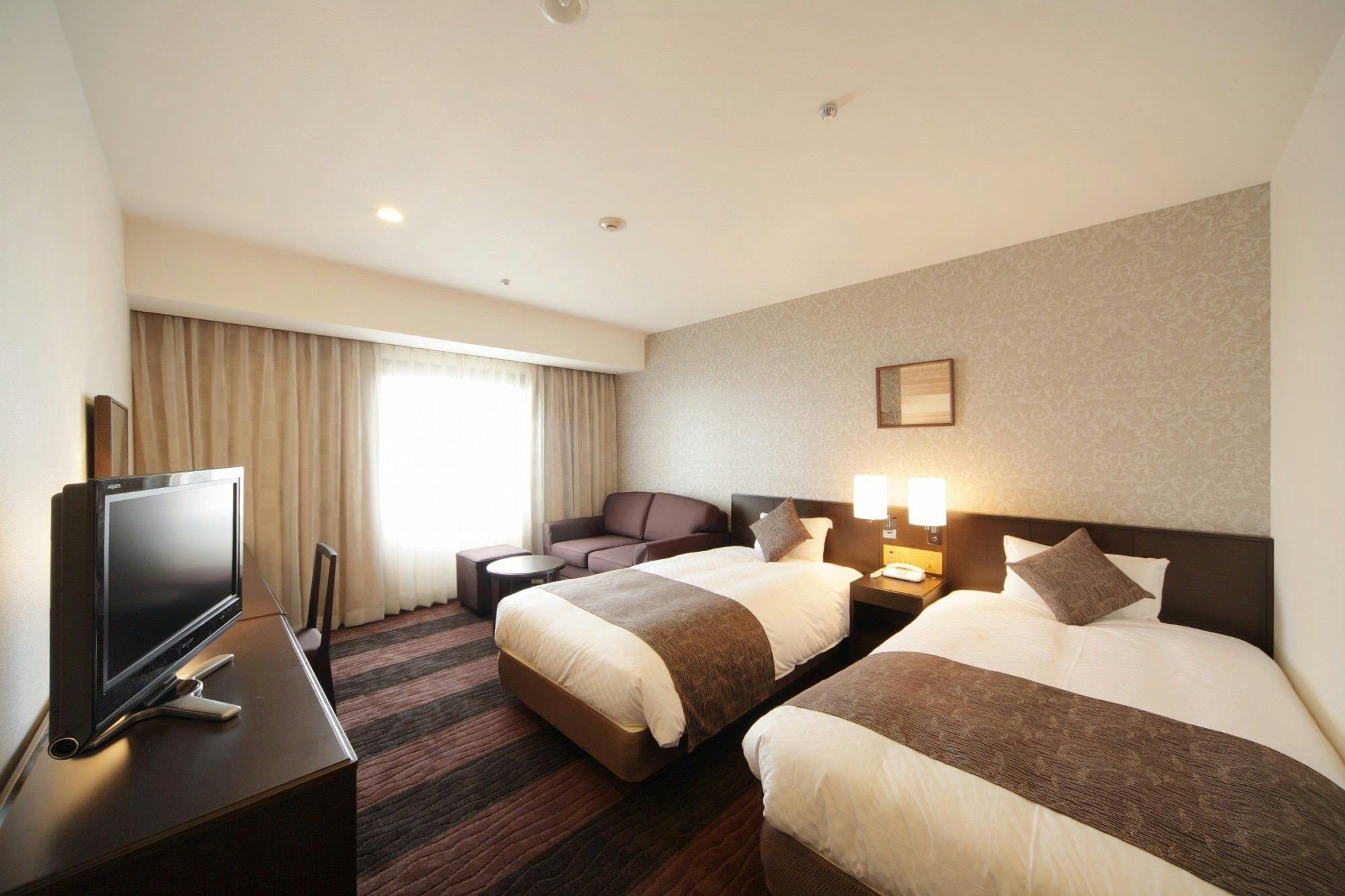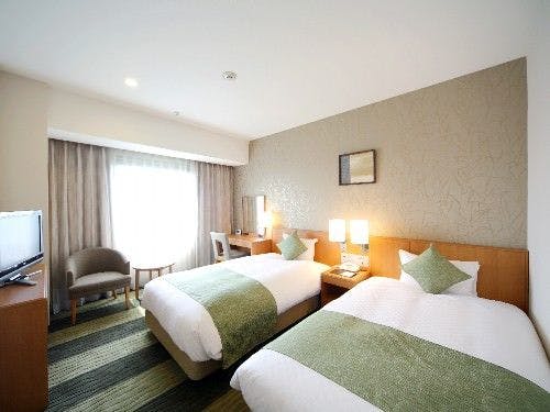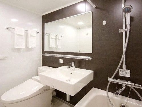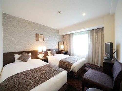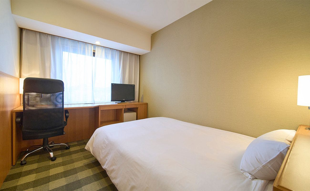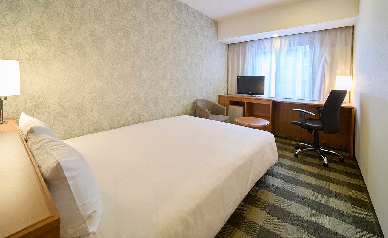 ベッド巾140cmのセミダブルベッド、ハイバック多機能チェアを装備した、居住性の高い客室です。・寝具はシモンズベッドにデュベスタイルの羽毛掛布団を採用、貸出しまくらも豊富にご用意で快適な睡眠をサポート。・26V液晶テレビ、加湿空気清浄機、電子冷却式の静音冷蔵庫(冷凍庫なし)、調光機能が付いた照明のほか、LANケーブルをお部屋に常備しております。・スライドバー式シャワー、温水洗浄トイレなどコンパクトで清潔感のあるバスルーム。