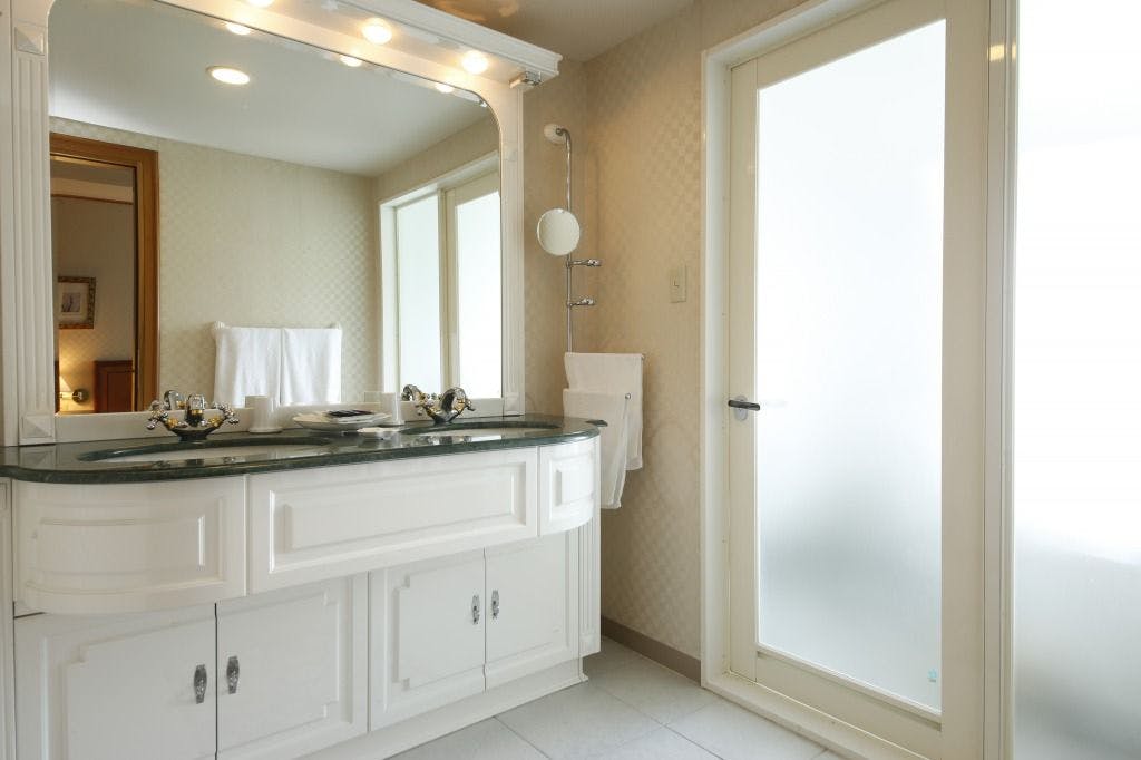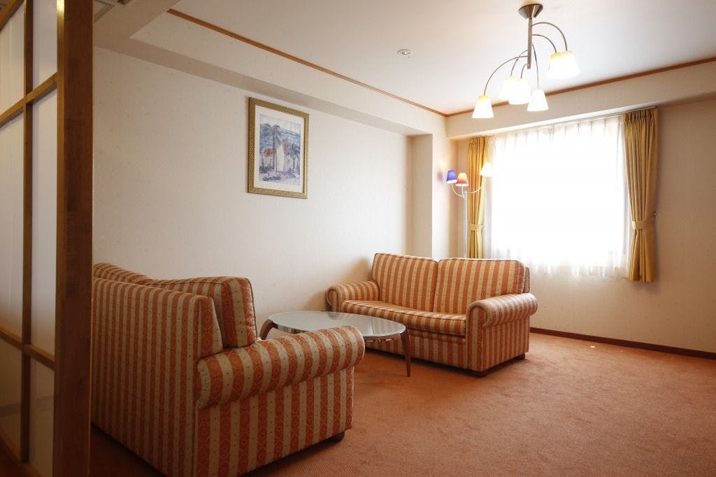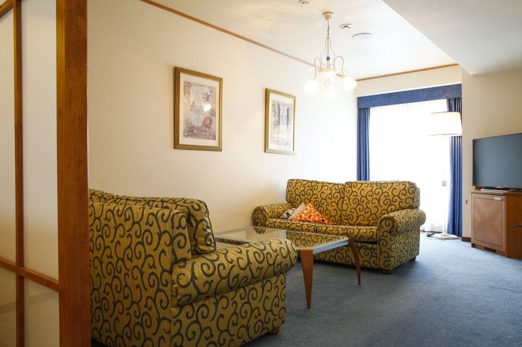 当館最上階に位置するお部屋からの眺めは格別。お風呂とバルコニーから美しい舞鶴湾を望めます。クイーンサイズのベッドを2台ご用意。リビングとベッドルームはセパレートになっています。