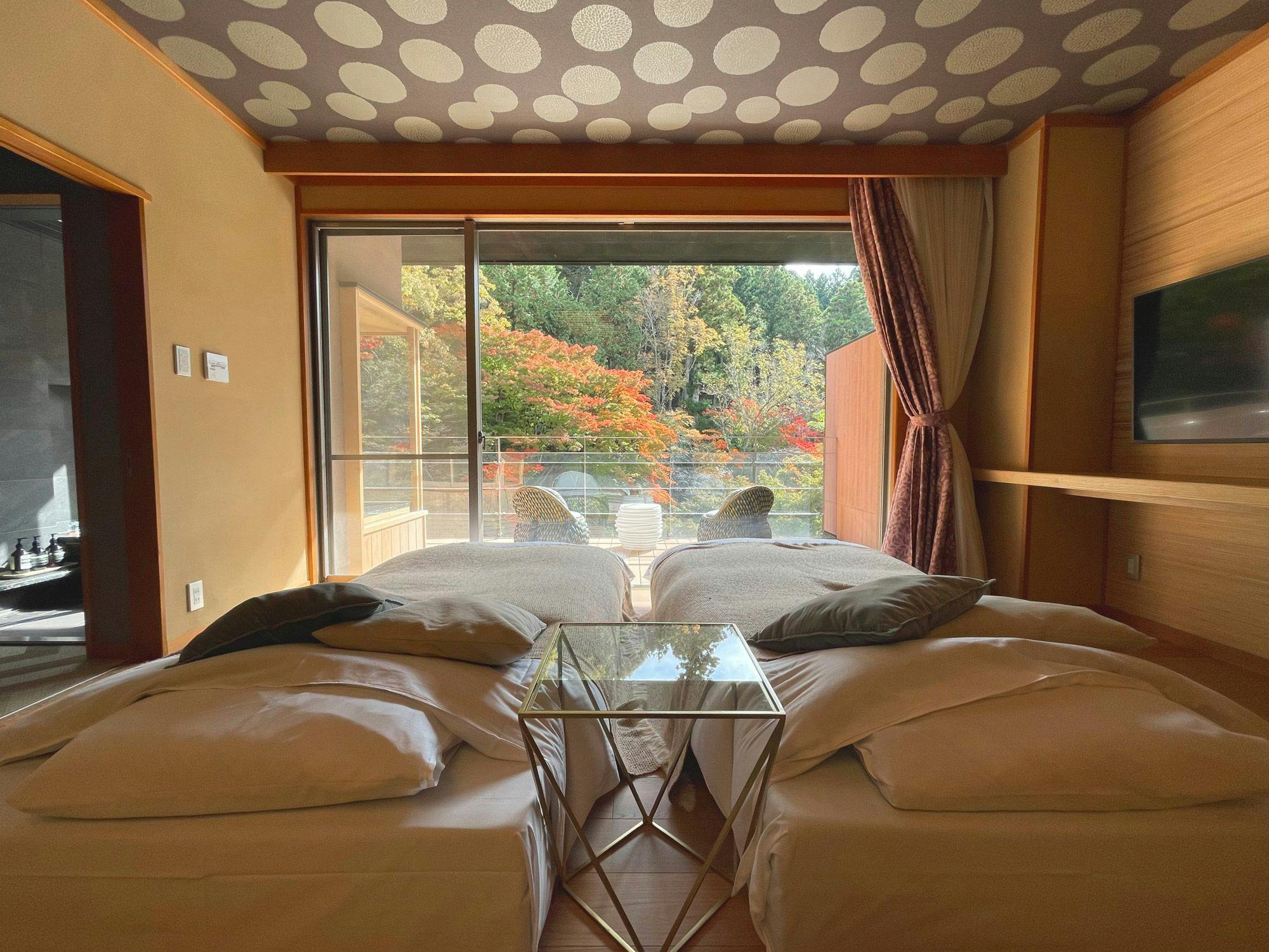 壮大な自然に囲まれた和のリゾートで心も体も至福のひとときを。客室の大きな窓から四季の移ろいをご堪能ください。