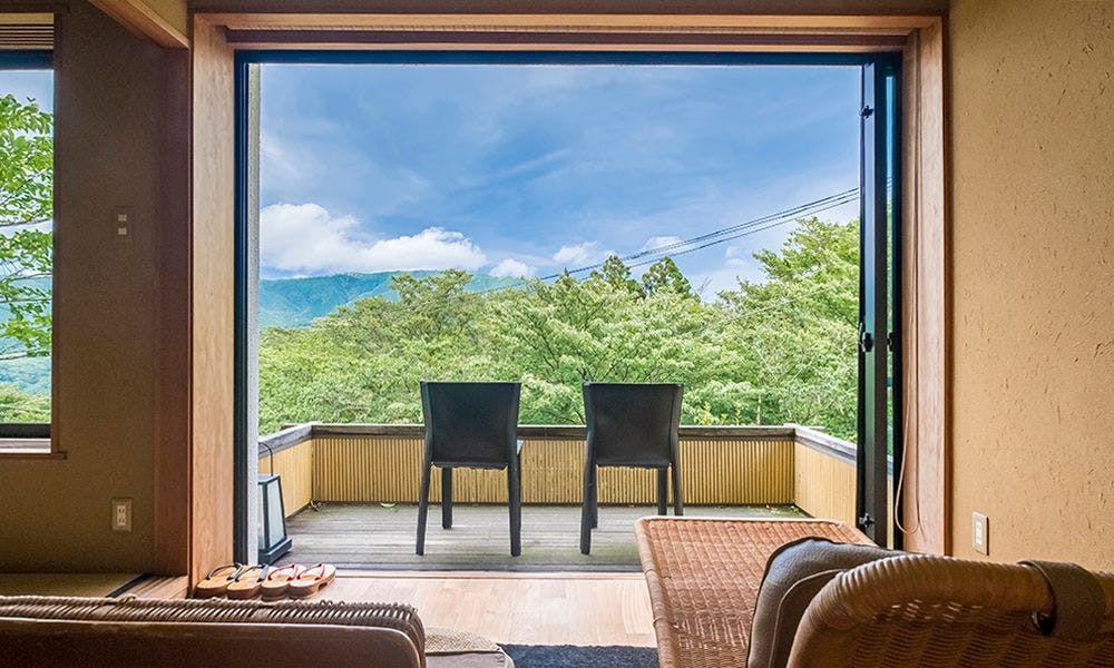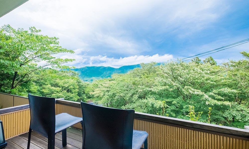 【全8室】「離れの個室露天風呂」で静かな瞬間を愉しむ大人の宿。標高800mの高台に佇み、箱根外輪山を望む事が出来ます。自慢の「源泉かけ流し100%白濁湯」「月替わり創作懐石料理」をお愉しみ下さい。