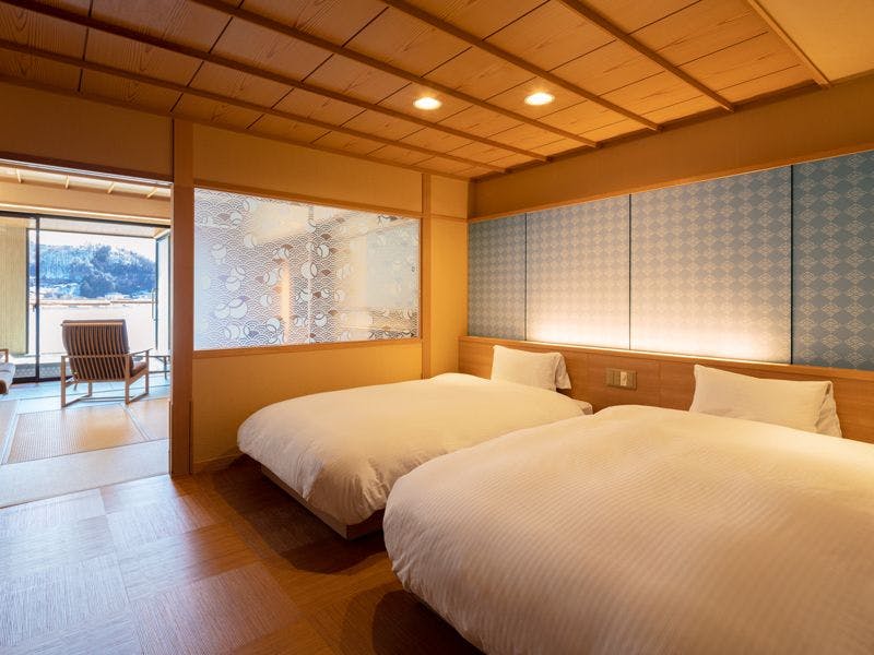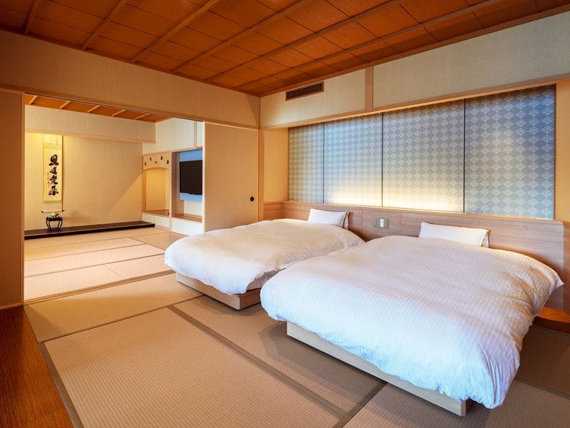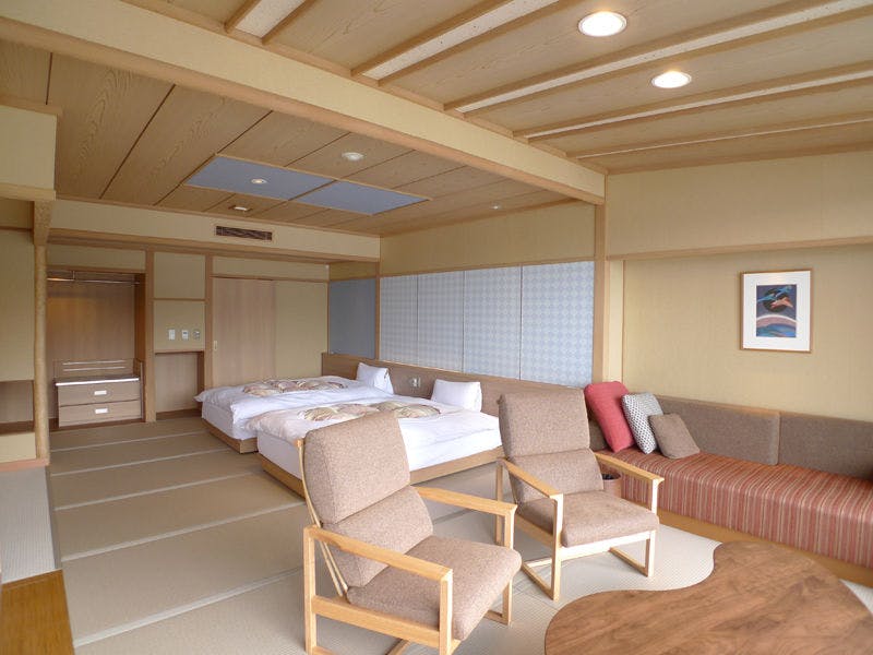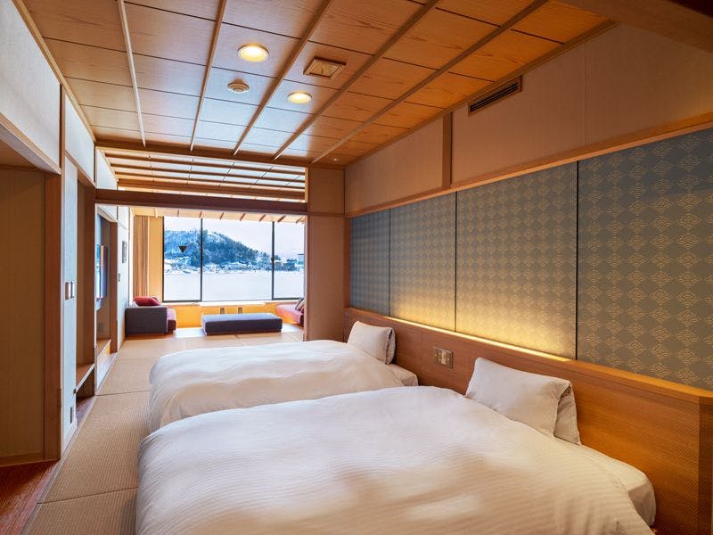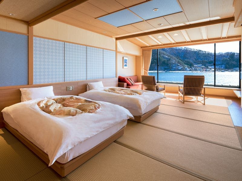 【定員】2~6名【階数】2~5階(指定できません)【眺望】富士山、河口湖側【食事】夕食:食事処/朝食:食事処【設備】バス・トイレ付 禁煙室 湯沸しポット ドライヤー 洗浄機付トイレ※ベッドは本間、または次の間に2台設置しております。※写真・間取りは一例です。※特定のお部屋指定は承りかねます。