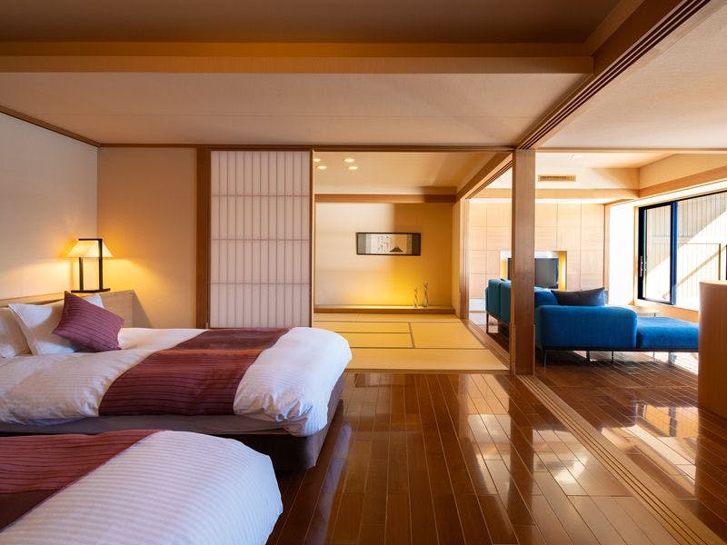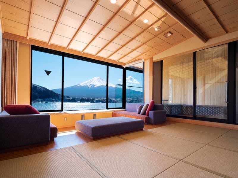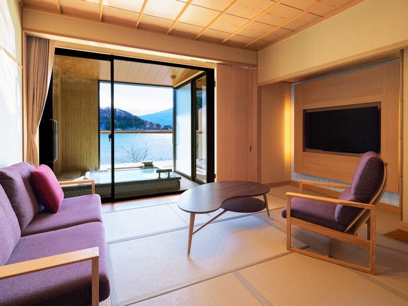 【間取り】和室+リビング+ベッドルーム+露天風呂付【定 員】2~6名【階 数】3階/4階(指定できません)【眺 望】富士山、河口湖側【食 事】夕食:食事処/朝食:食事処【設 備】客室露天風呂・トイレ付 禁煙室 湯沸しポット ドライヤー 洗浄機付トイレ ベッド※客室露天風呂は温泉ではございません。※写真・間取りは一例です。※特定のお部屋指定は承りかねます。