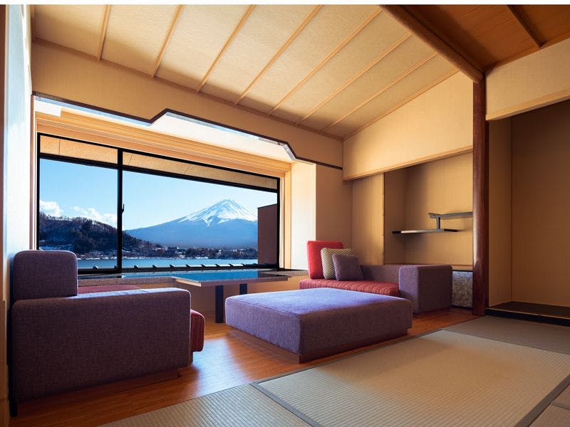 【間取り】和室+リビング+ベッドルーム+露天風呂【定 員】2~6名【階 数】3~4階(指定できません)【眺 望】富士山、河口湖側【食 事】夕食:食事処/朝食:食事処【設 備】客室露天風呂・トイレ付 禁煙室 湯沸しポット ドライヤー 洗浄機付トイレ ベッド※客室露天風呂は温泉ではございません。※写真・間取りは一例です。※特定のお部屋指定は承りかねます。