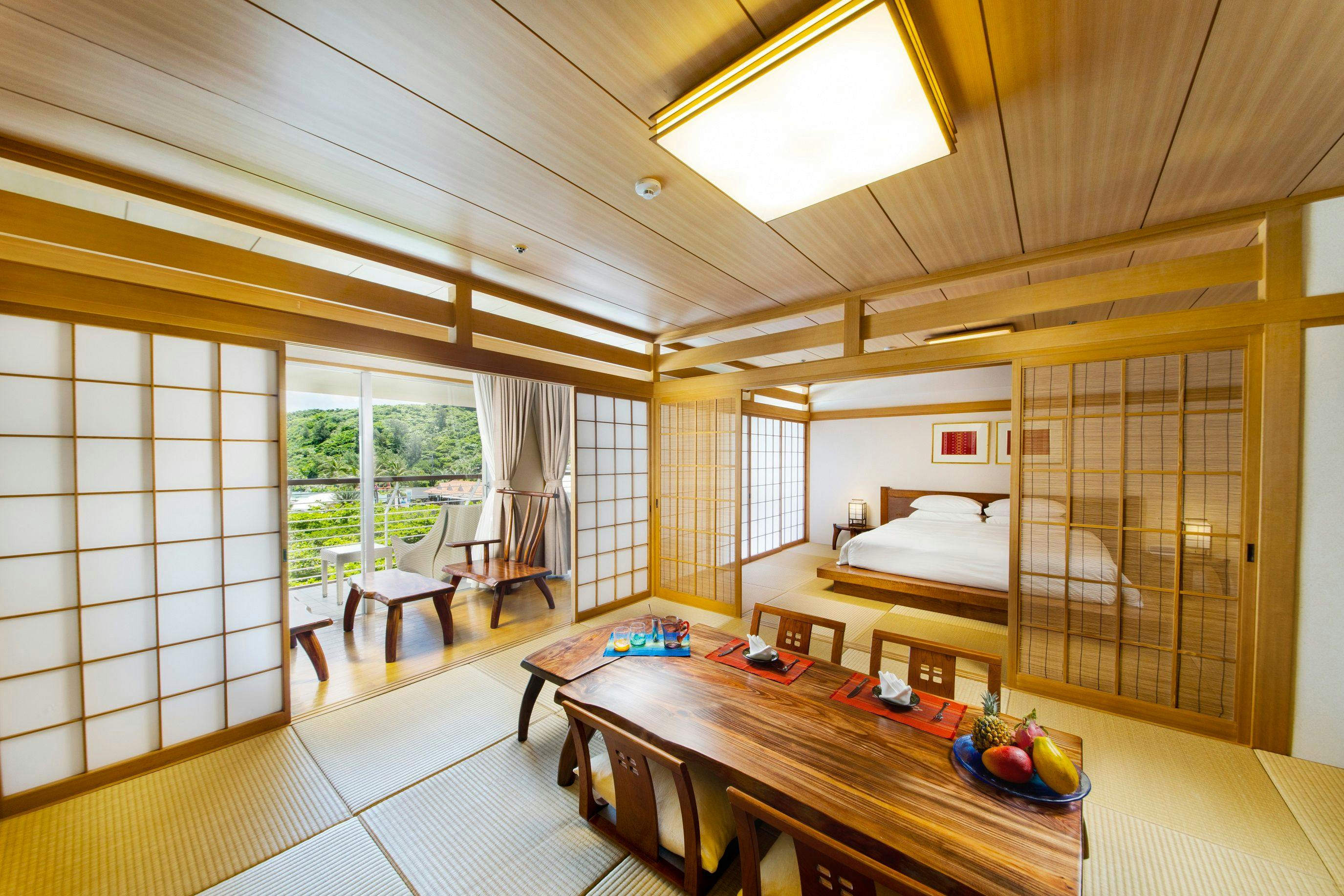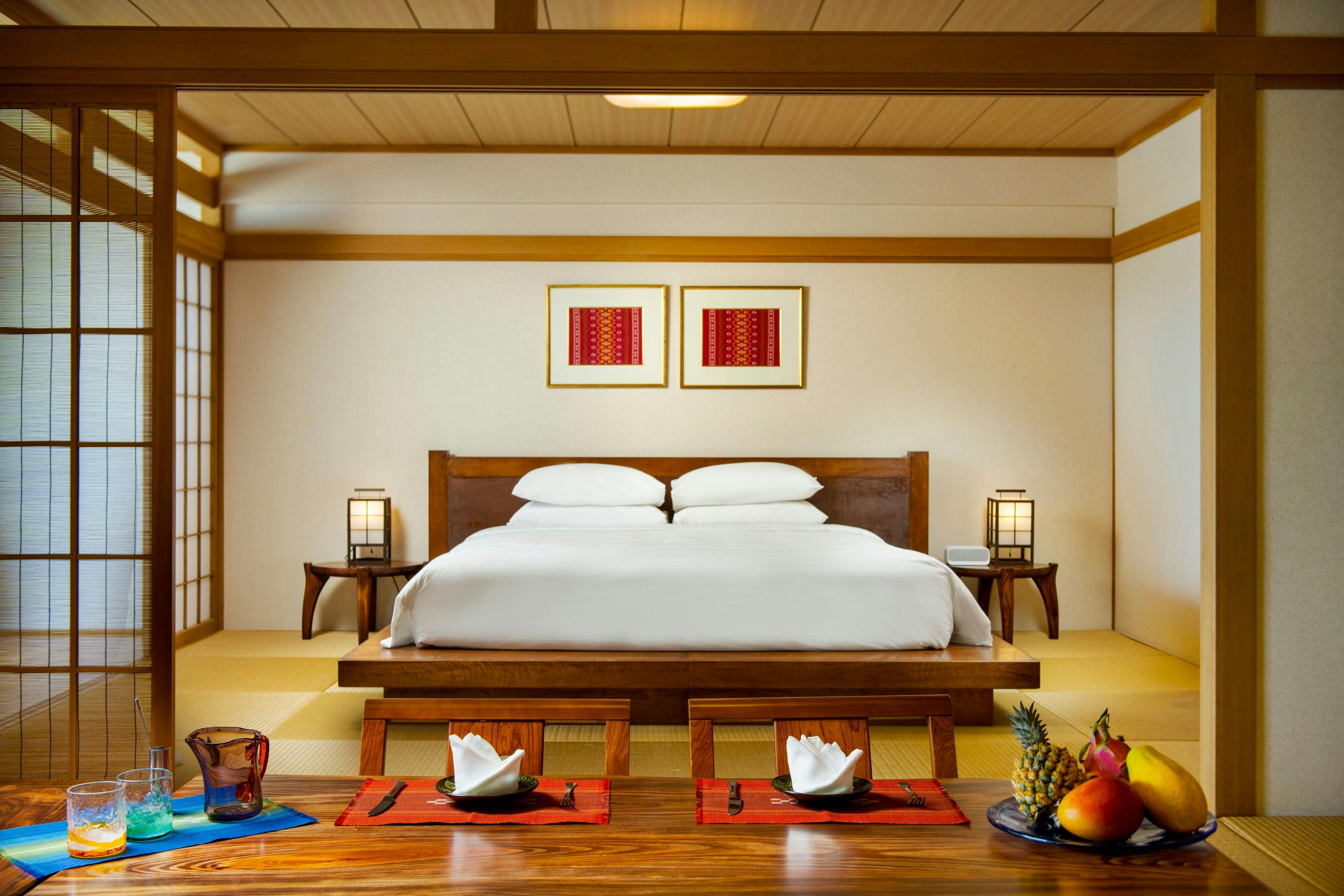 琉球畳、琉球松で作られた家具、沖縄の伝統工芸などでしつらえた2間続きの和室。