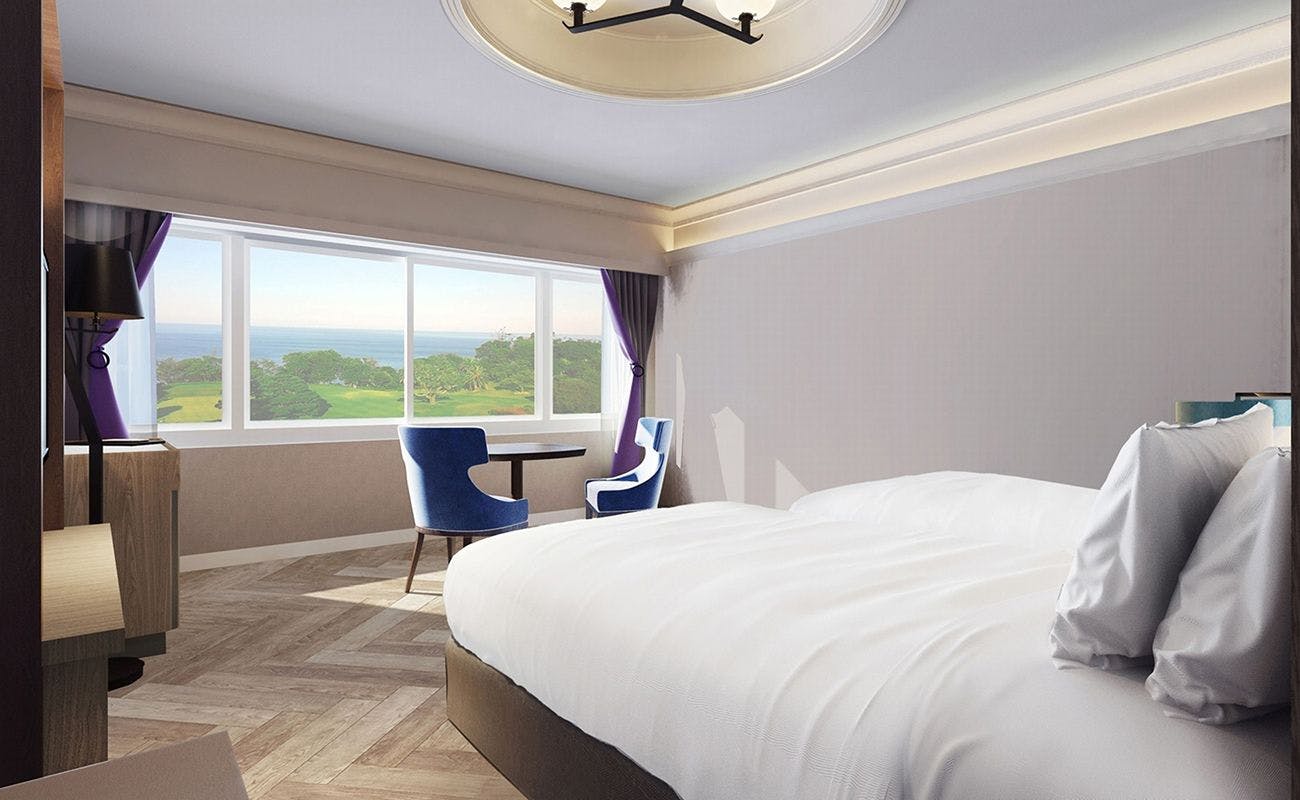 温暖な気候に恵まれた景勝の地、伊豆「川奈」。雄大な自然の中に溶け込むように建つ川奈ホテル。海側の客室からは相模灘や伊豆諸島を望み、山側の客室からは四季折々のさまざまな表情をみることができます。