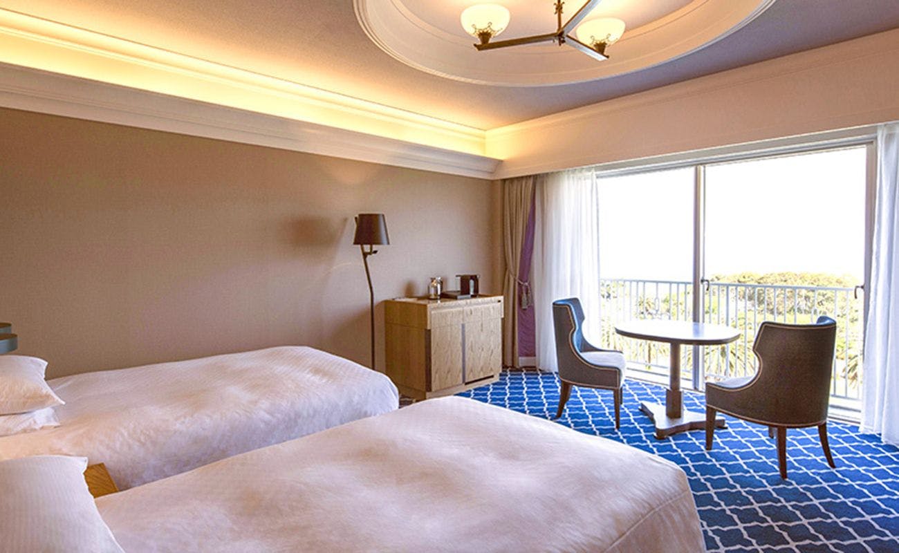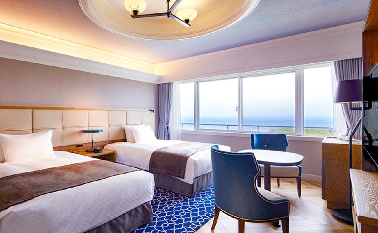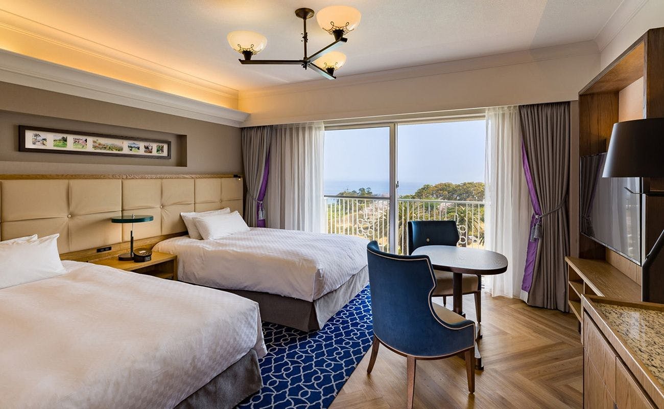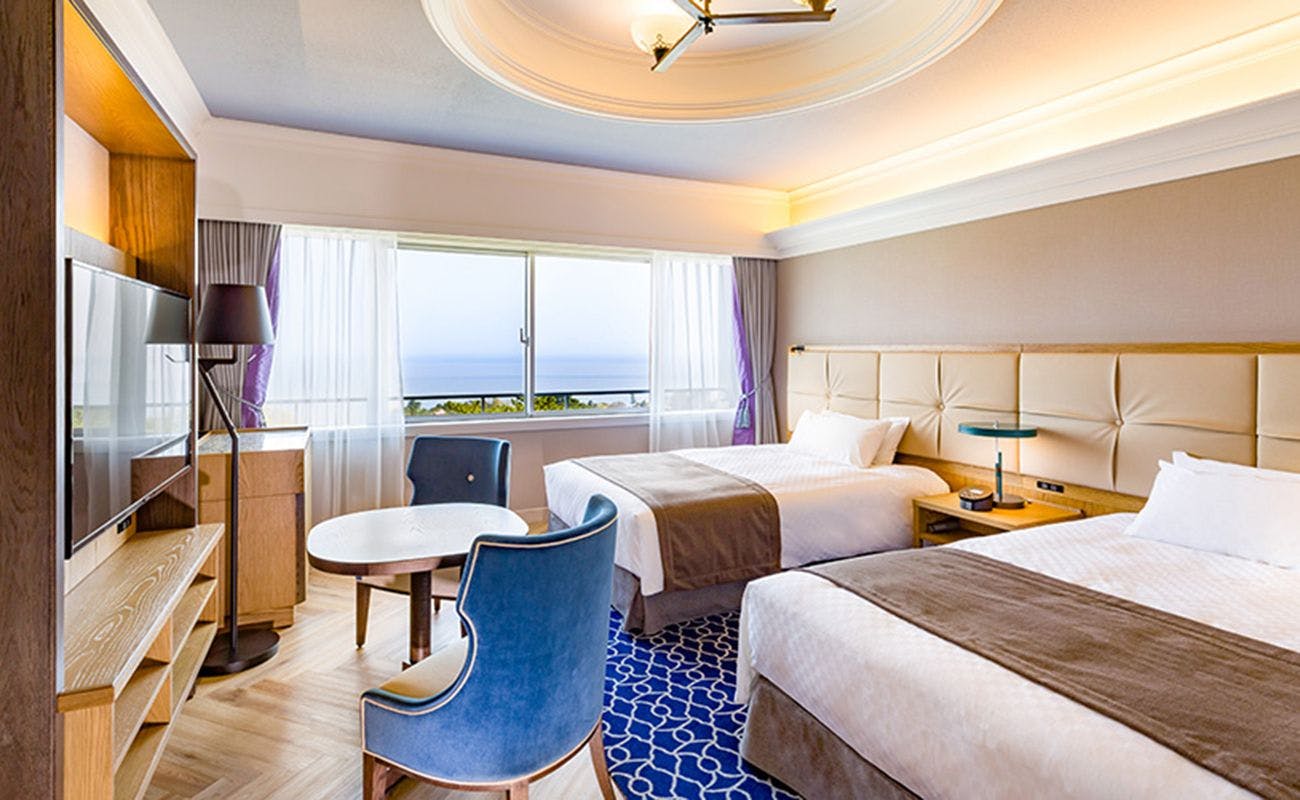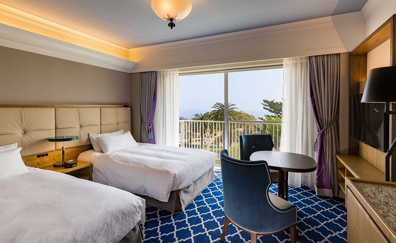 バス・シャワー・トイレ付き最大2名さままで利用できます(ベッドの追加不可)おだやかな海と伊豆大島を望む開放感あふれるオーシャンビューのお部屋でお寛ぎ下さい。美しい景色が心も身体(からだ)も癒してくれることでしょう。※客室画像は一例です。バルコニーのない部屋もございます。