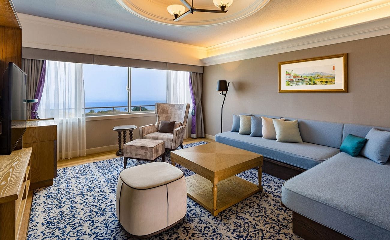 おだやかな海と伊豆大島を望む、開放感あふれる海側のお部屋でお寛ぎ下さい。美しい景色が心も体も癒してくれるでしょう。