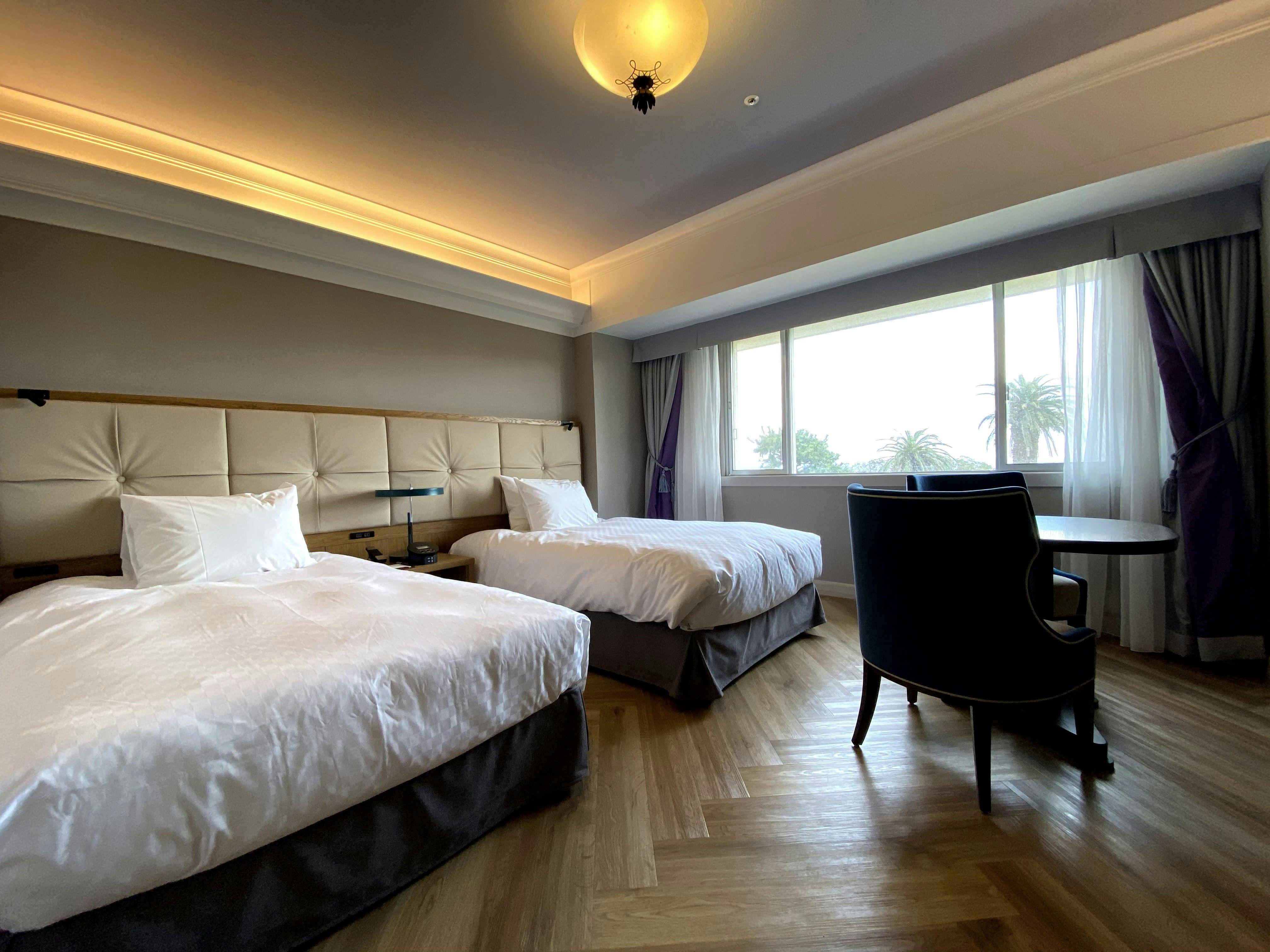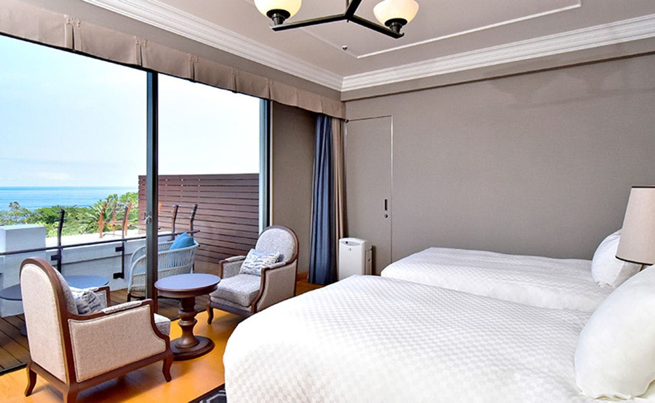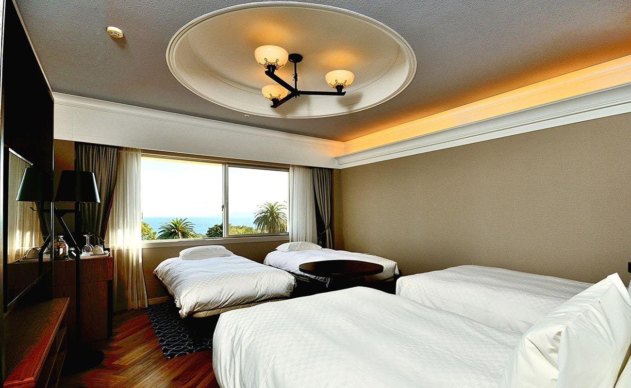 バス・シャワー・トイレ付きエキストラベッドを追加することで3名さままでご利用できます。クラシカルな雰囲気とベッドにいながら雄大な自然をご堪能いただけます。窓から見えるおだやかな海と伊豆大島を望む開放感あふれるオーシャンビューのお部屋でお寛ぎ下さい。