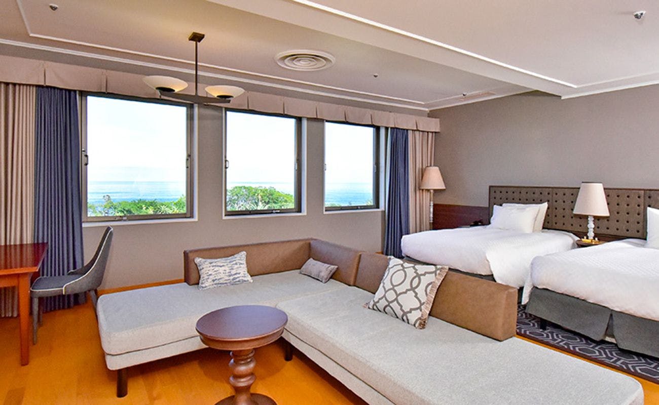 バス・シャワー・トイレ付きベッドはゆったり広めのワイドサイズです。※3名様ご利用時は1名さまエキストラベットにて対応となります寛ぎと心地よさを感じるコーナーの客室。至福のひとときを開放感あふれるオーシャンビューのお部屋でお寛ぎ下さい。※客室画像は一例です。バルコニーのない部屋もございます。