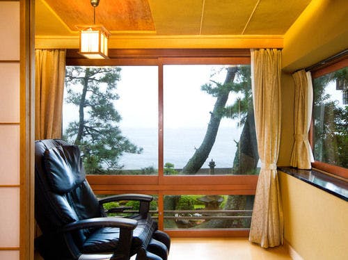 欄間などに古きよき趣を残す和室で寛ぎの時間を。窓からは広がる海をご覧頂けます。朝日に染まる水平線やムーンロードなどを眺め、ゆったりとお過ごし下さい。