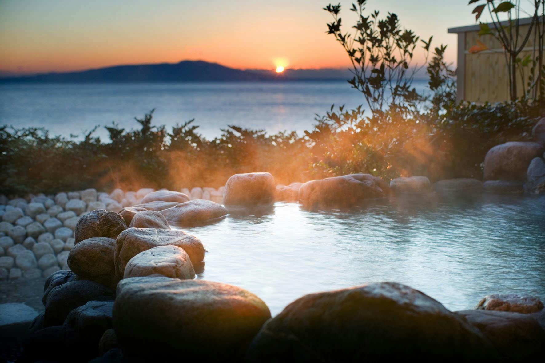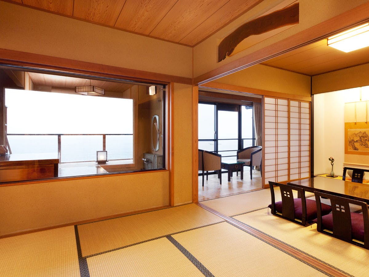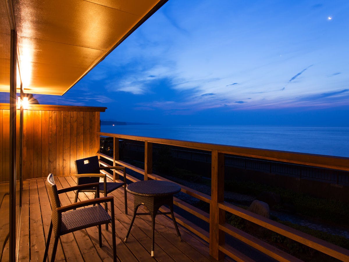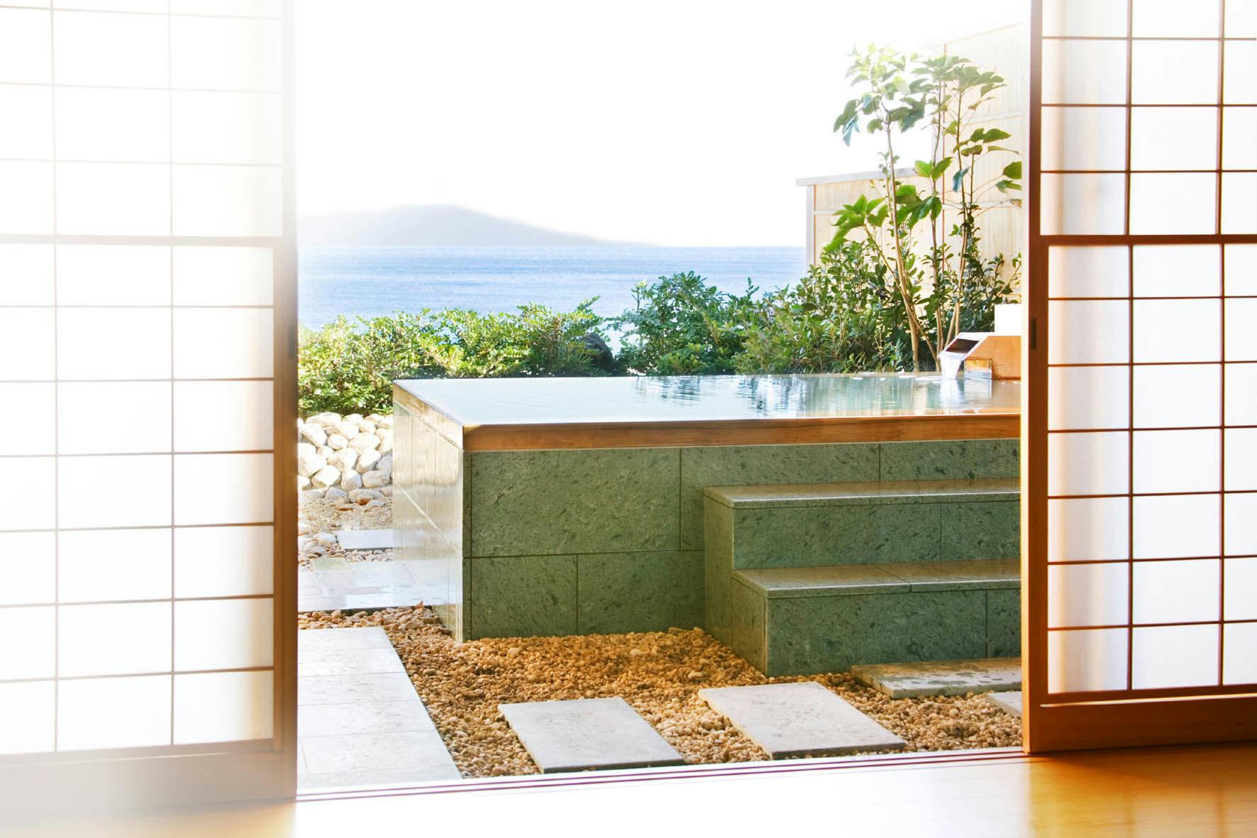 贅を尽くした3タイプの客室で自家源泉掛け流しの湯を独占。ゆったりとした湯船から自家源泉かけ流しの天然温泉が溢れ、目の前には、時と共に色を変える海の絶景。天然温泉と絶景を独占する贅沢をお楽しみください。
