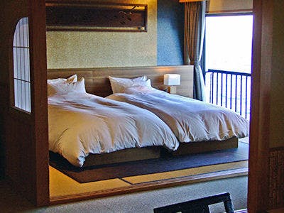 夕食が北川ロマンからロマン輝きへグレードアップモダンな和洋室。目の前に広がる相模湾をベッドルームからもご覧いただけます。広々とした機能的な客室は三世代でお過ごしいただくにも十分な空間です。※階段での移動が必要となります
