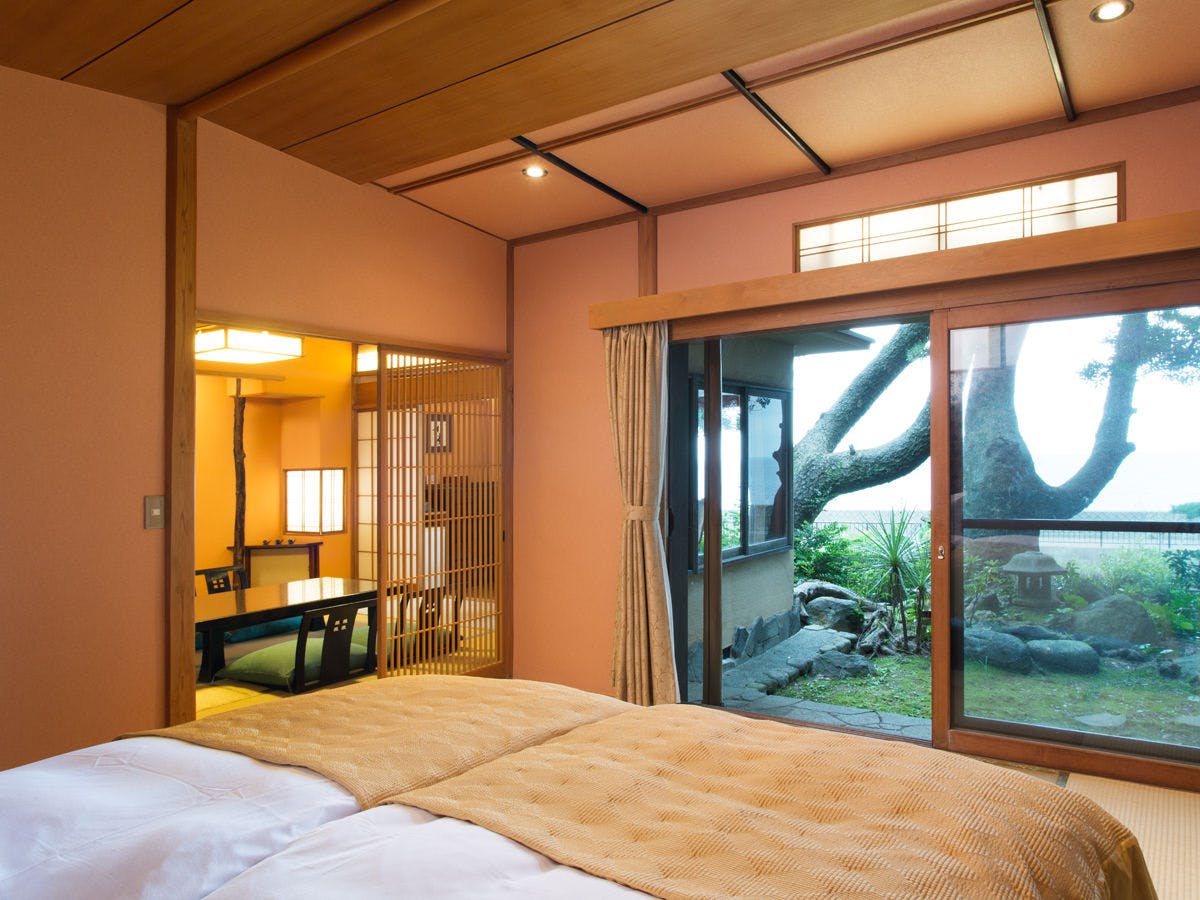 和の落ち着きと洋の快適さを併せ持つモダンな和洋室。ハリウッドツインのベッドを備えた2間客室の窓からは緑豊かな庭園と相模湾を望み、鮮やかなコントラストが目の前に広がります。喧騒から離れ潮騒に包まれながら寛ぎの時間をお愉しみください。