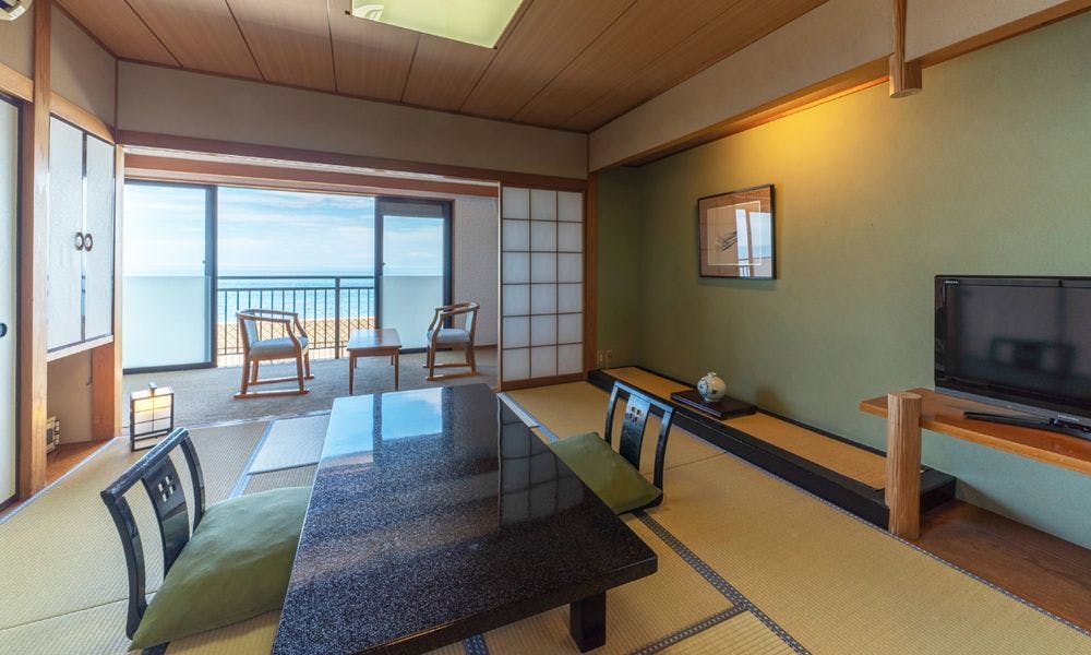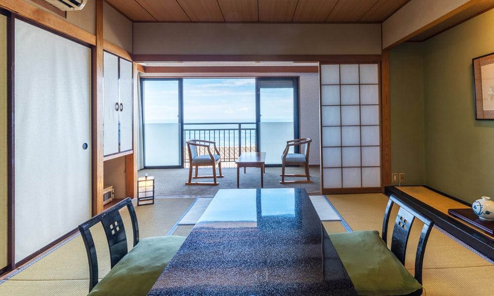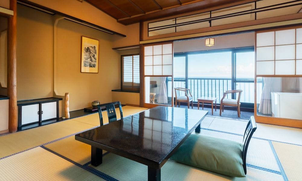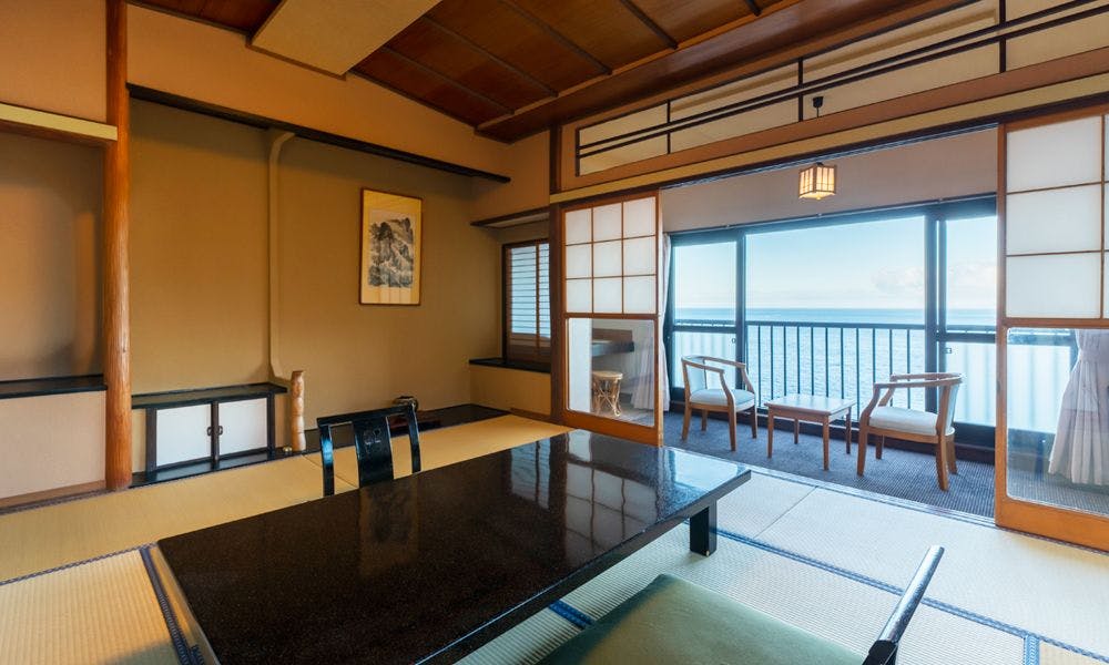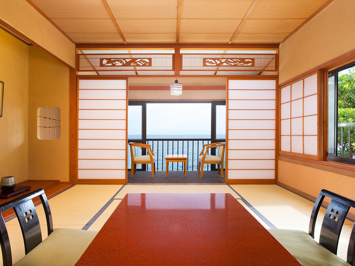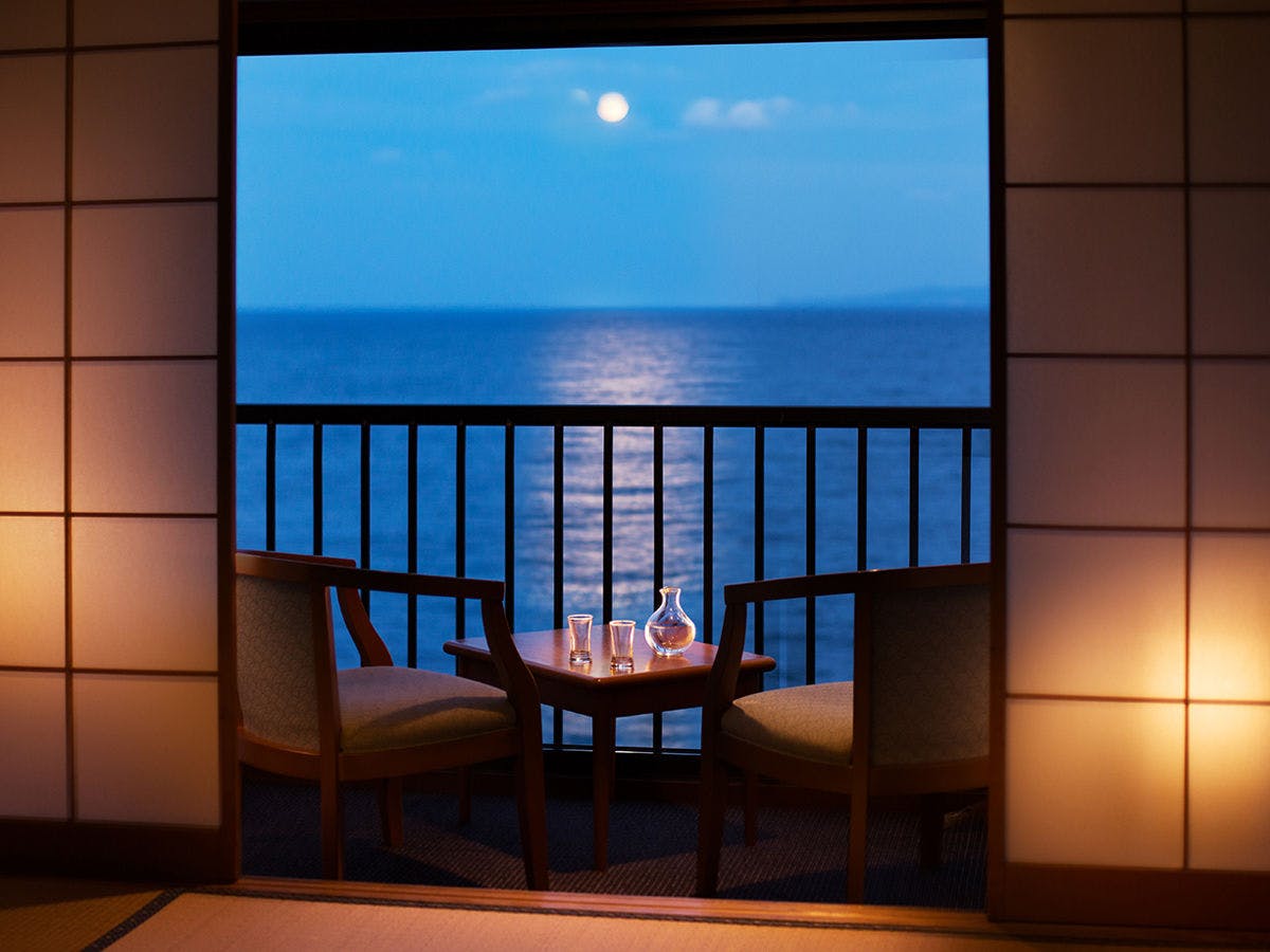 欄間などに古きよき趣を残す和室で寛ぎの時間を。窓からは広がる海をご覧頂けます。満月の夜は客室のテラスから北川名物ムーンロードをご覧いただけます。