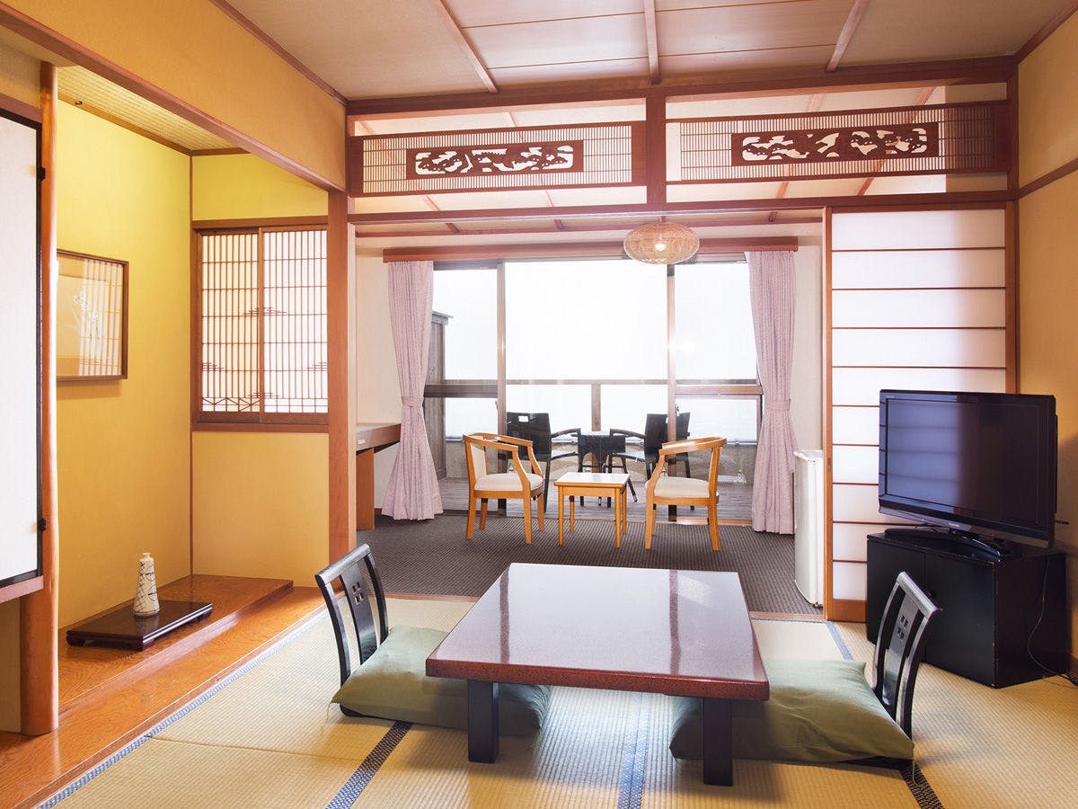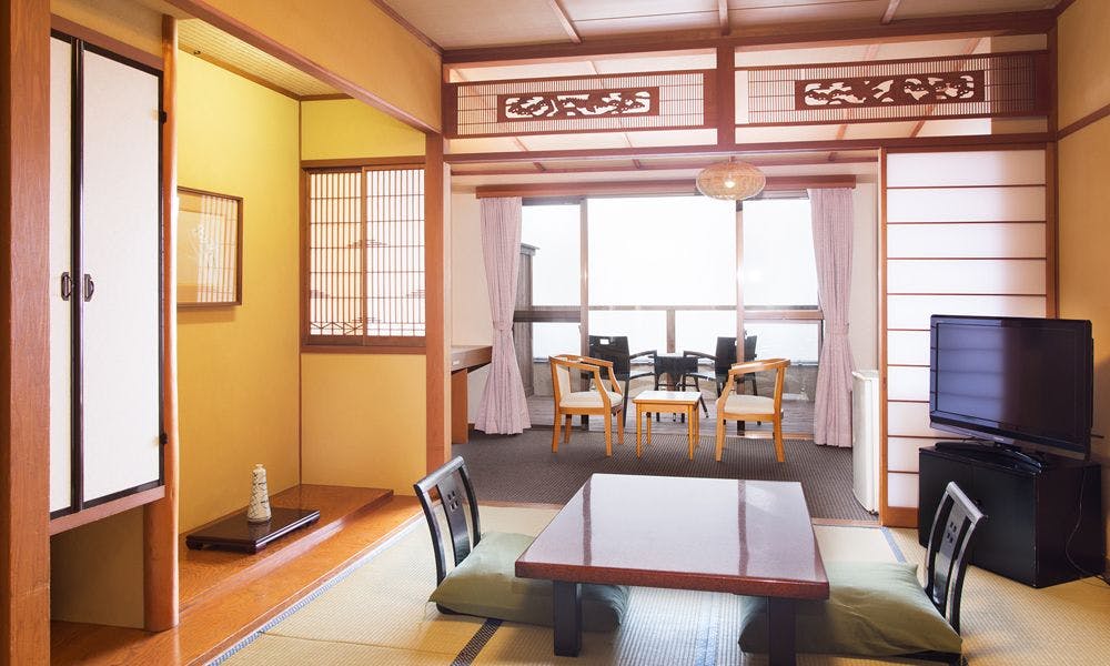夕食が北川ロマンから華膳へグレードアップ欄間などに古きよき趣を残す和室で寛ぎの時間を。窓からは広がる海をご覧頂けます。朝日に染まる水平線やムーンロードなどを眺め、ゆったりとお過ごし下さい。