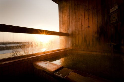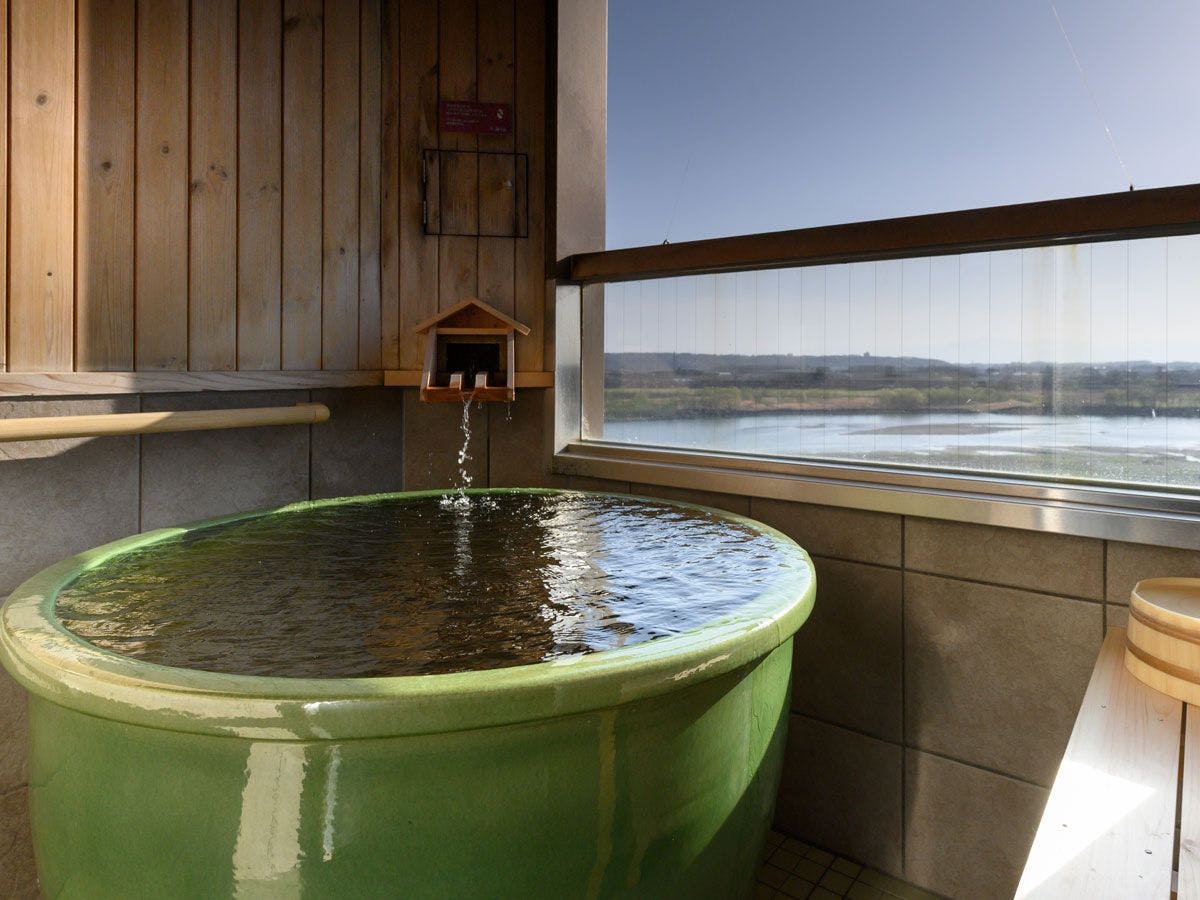 丸い壺湯(バスタブ)の展望露天風呂では、十勝川と大きな空の眺めをお愉しみください。