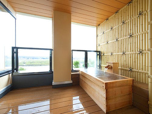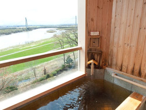 檜の香に包まれながら入る露天風呂からは、悠々と流れる十勝川の絶景が広がります。
