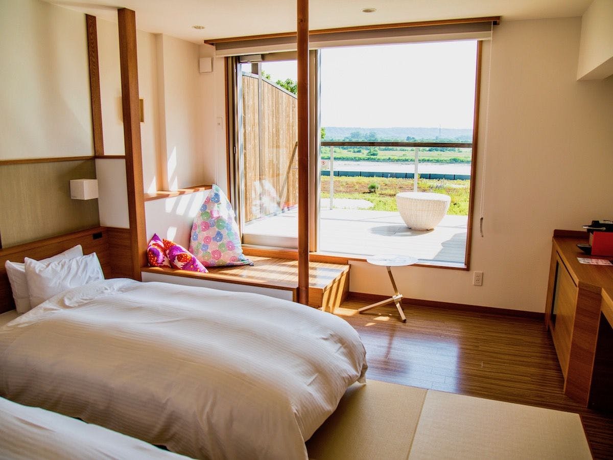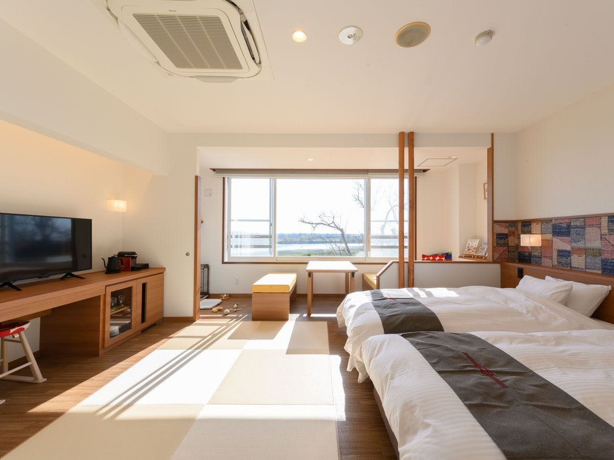 ツインベッド+お客様がご自由にご利用いただけるお布団をご用意いたしました。最大3名様までご宿泊可能。