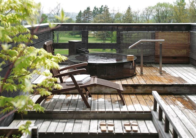 テラスには眺望の良い秋田檜の露天風呂を完備し、自然素材に包まれた快適な滞在をお楽しみいただけます。