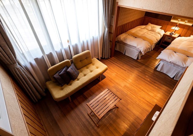 1階部分は洋室でツインベッドを配置し、2階部分は、和室をご用意。4名様がご宿泊可能な唯一メゾネットタイプのお部屋。