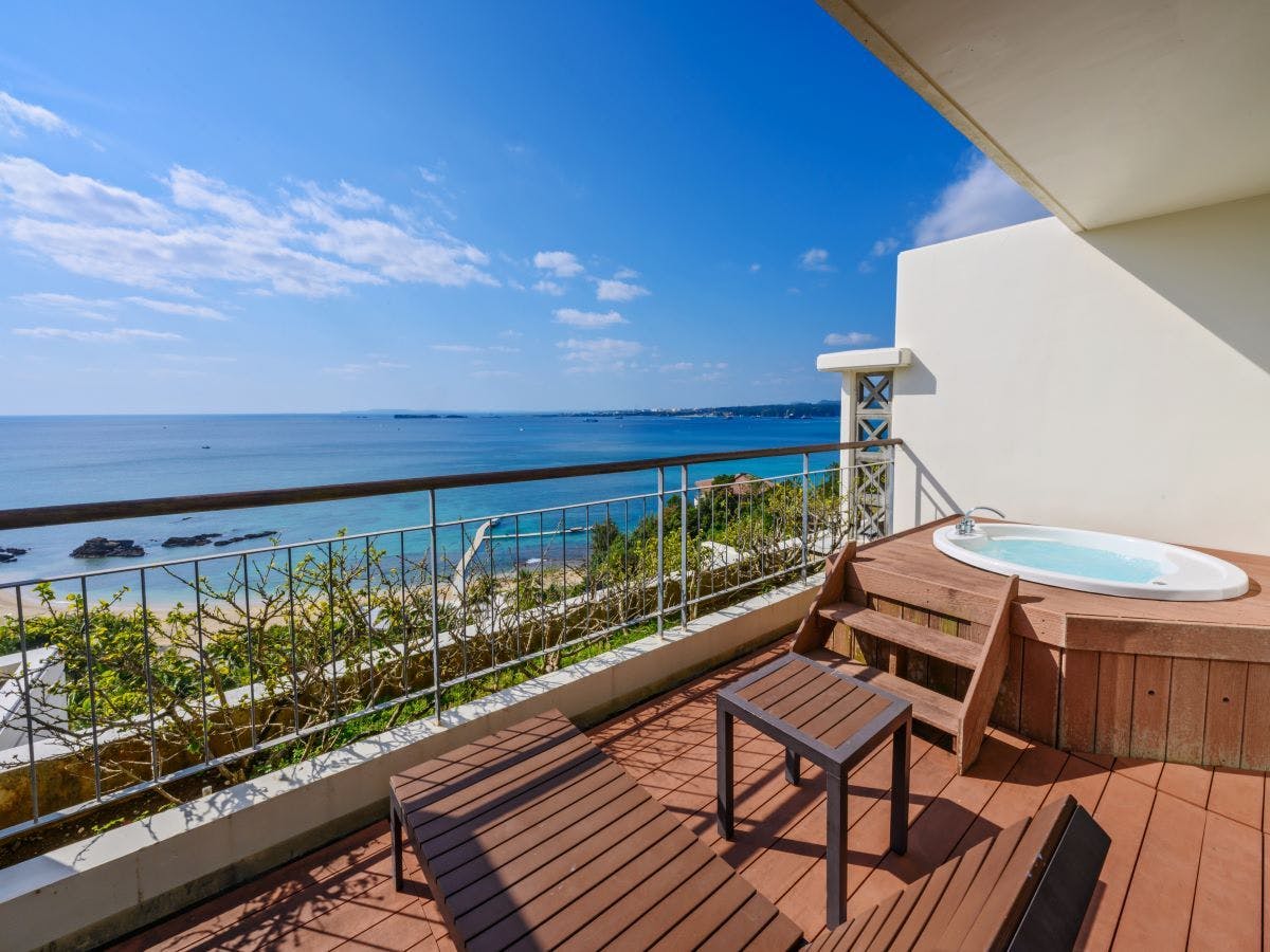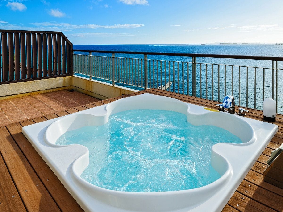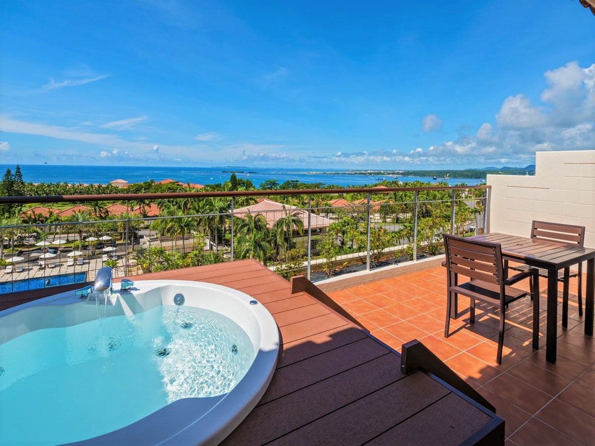 波の音が聞こえるバルコニー。そこにあるジェットバスでは、美しい大海原を眺めながら、優雅な時間をお過ごしください。南国リゾートを華やかに演出する、洗練されたひとときをお届けします。