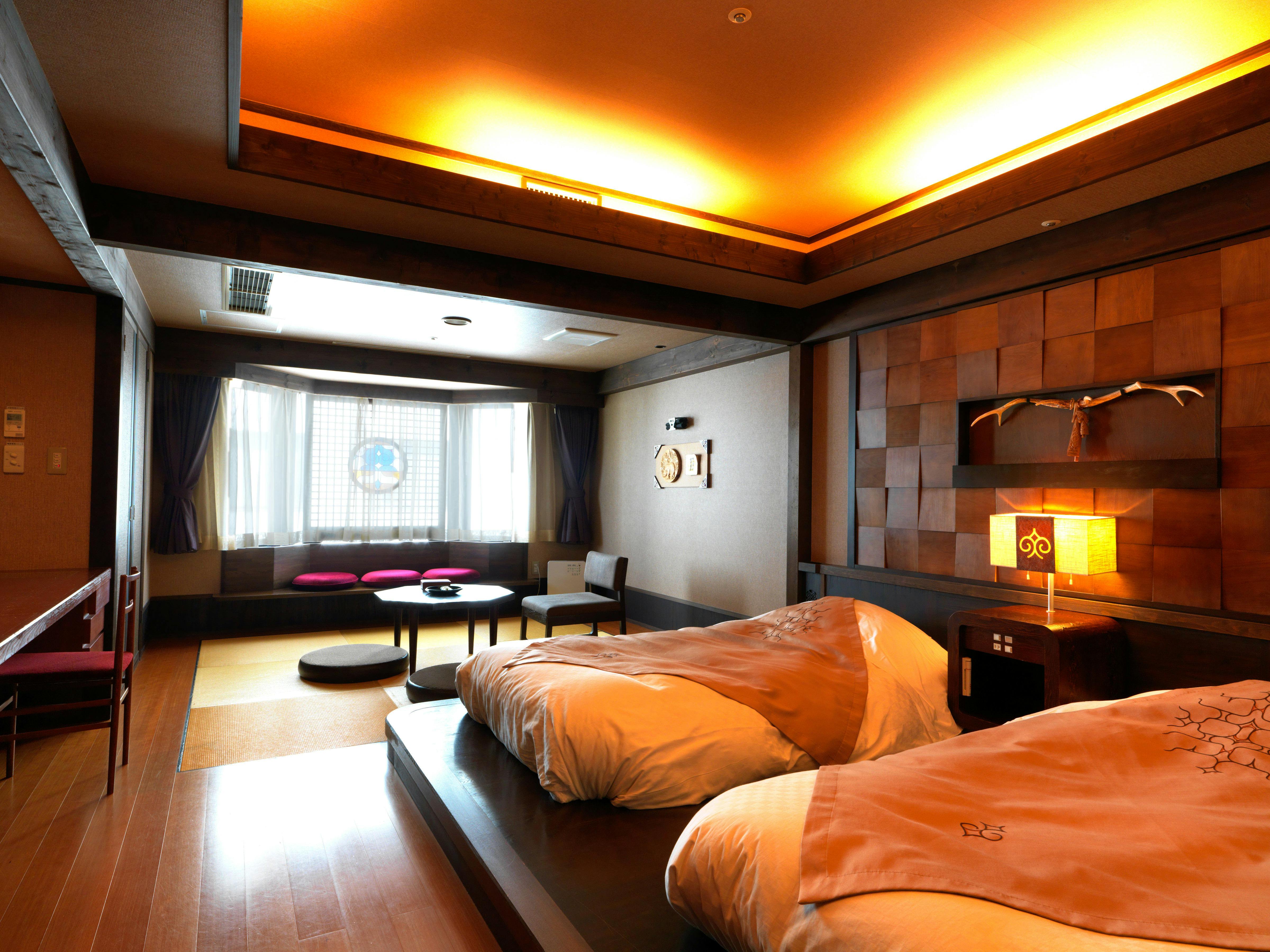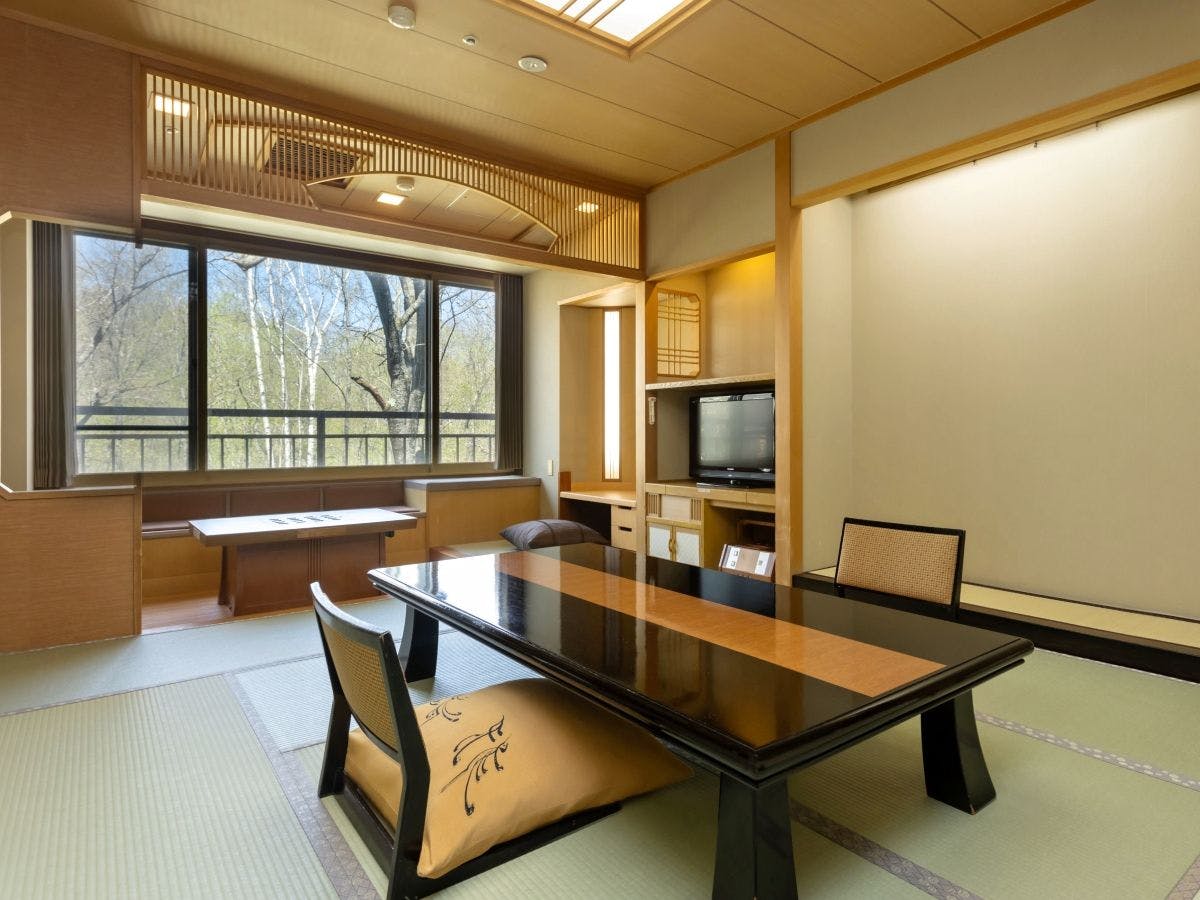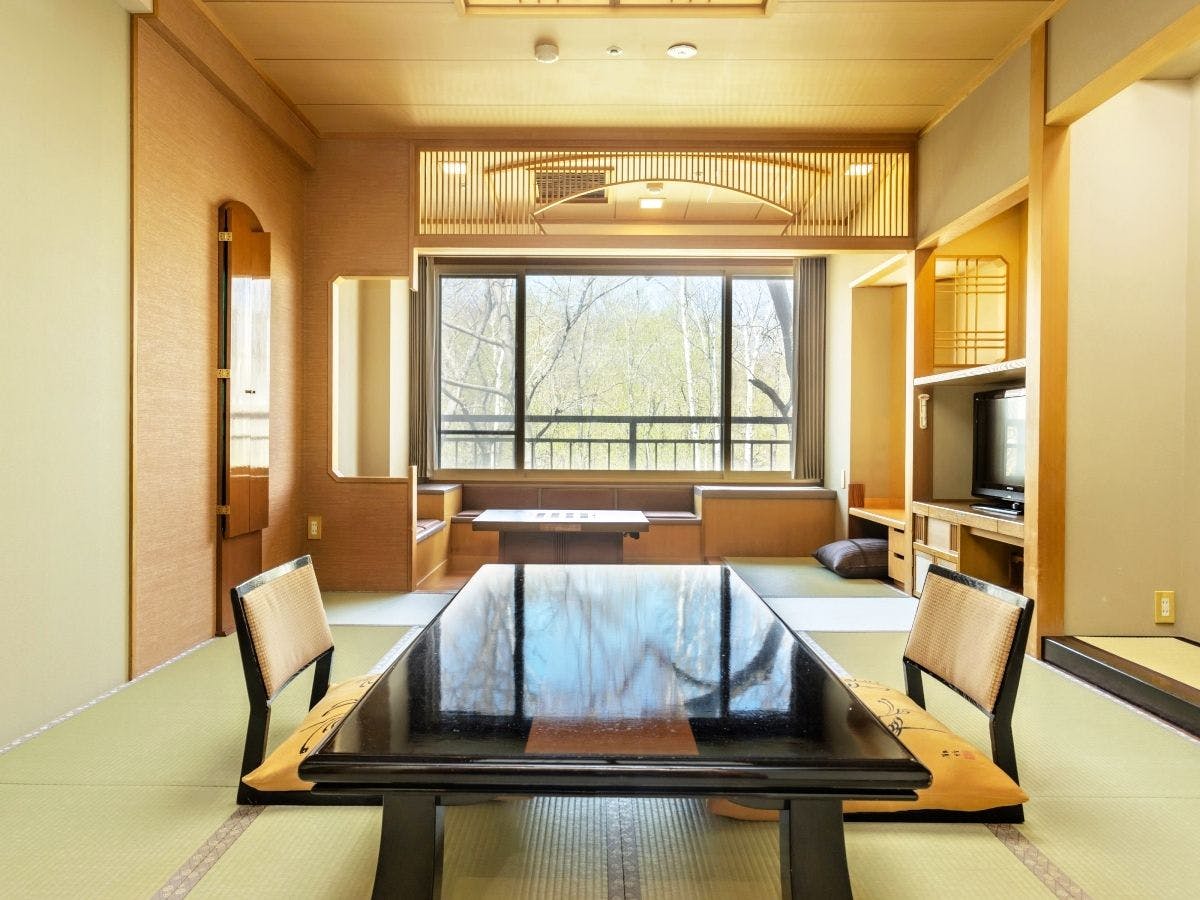 高層階にある広々とした和洋室。和室、ベッドルーム、掘りごたつの食事スペースで快適にお過ごしいただけます。また、和室とベッドルームいずれの窓からも、阿寒の森を見渡せます。
