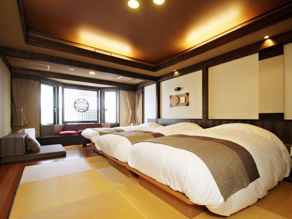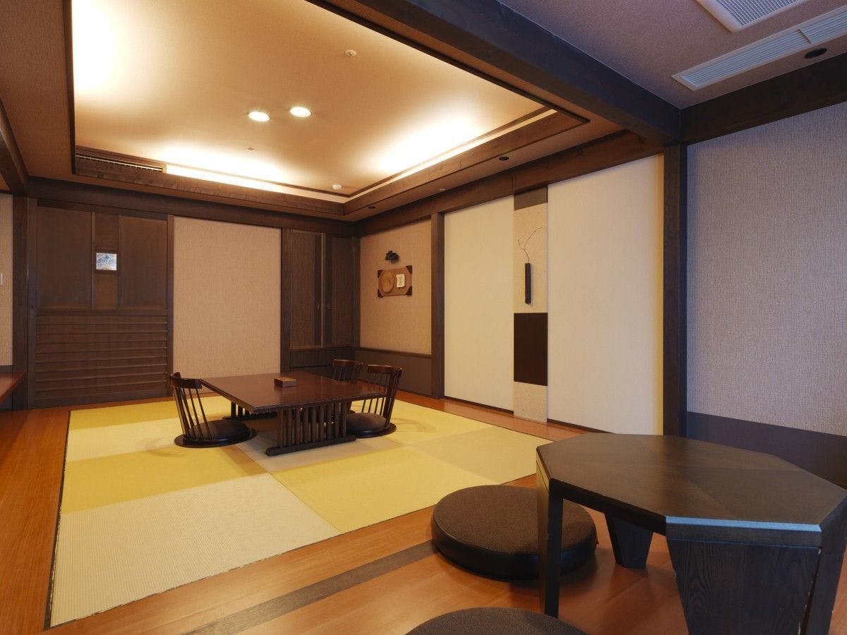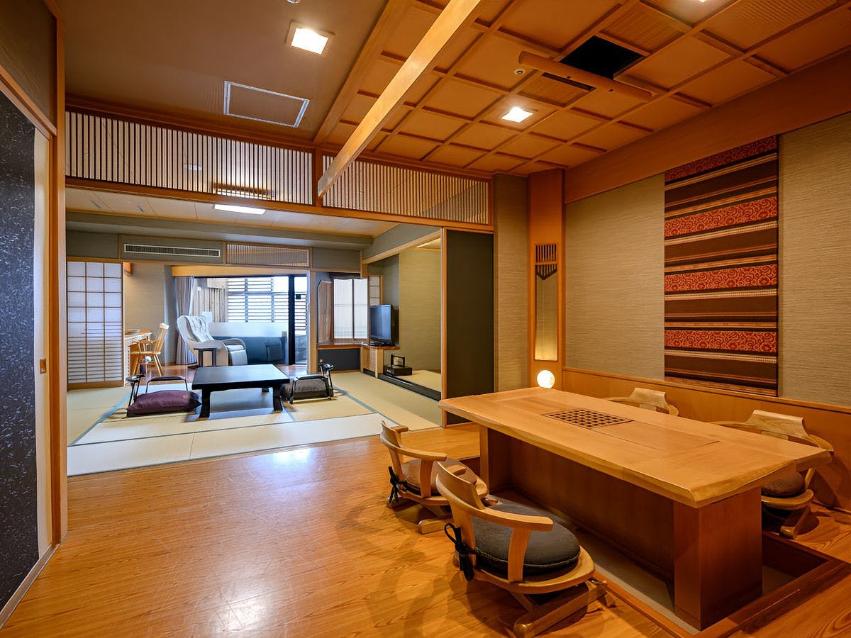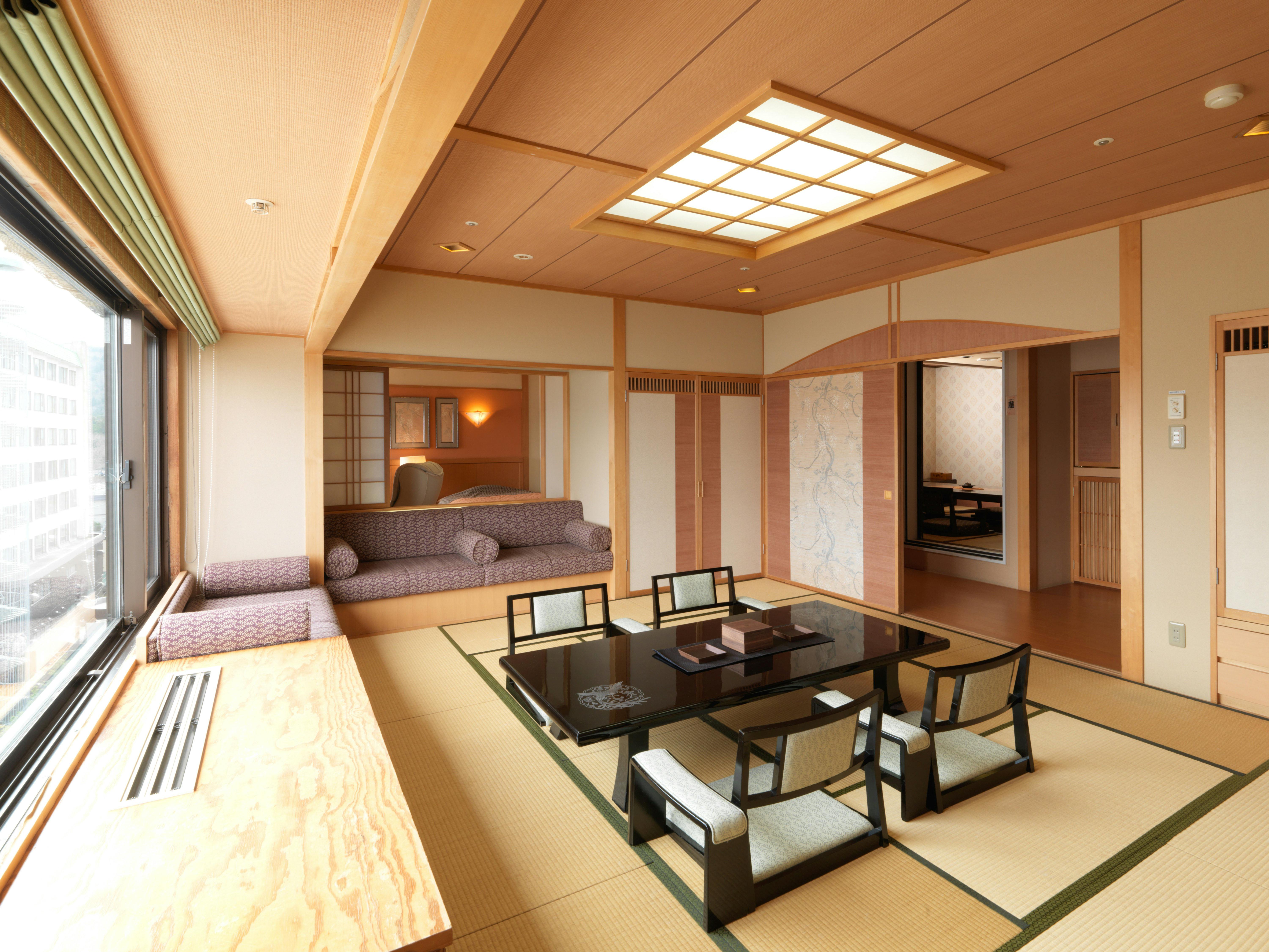 高層階にある広々とした和洋室。和室、ベッドルーム、掘りごたつの食事スペースで快適にお過ごしいただけます。また、和室とベッドルームいずれの窓からも、阿寒の森を見渡せます。