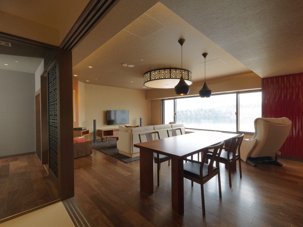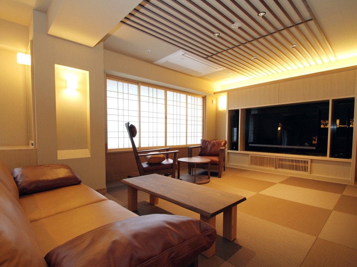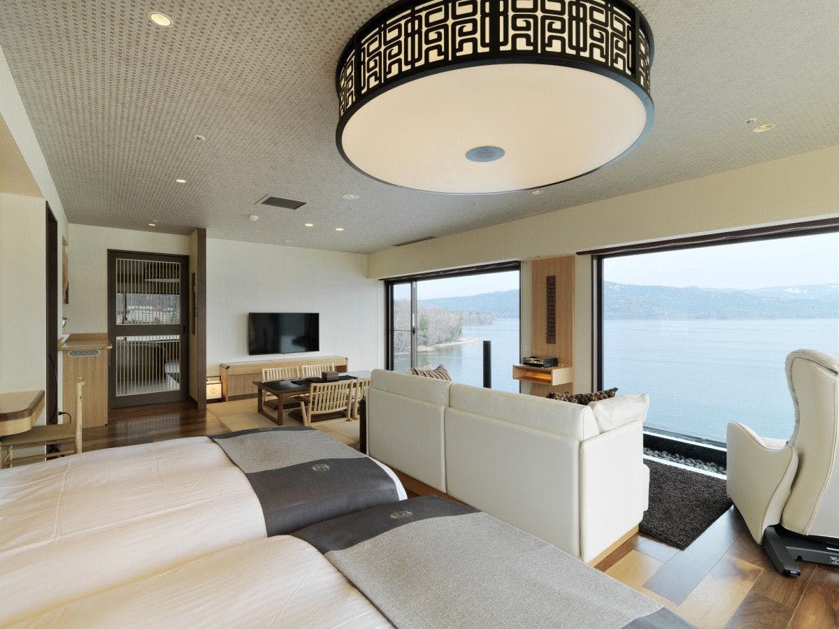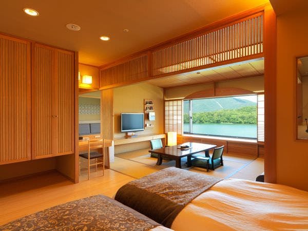 阿寒湖を望む、広々とした和洋室です。和室リビングには、マッサージチェアと大きなソファがあり、ゆったりとお寛ぎいただけます。