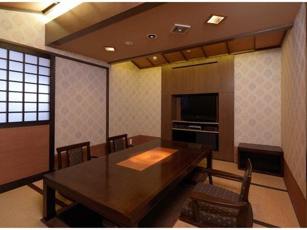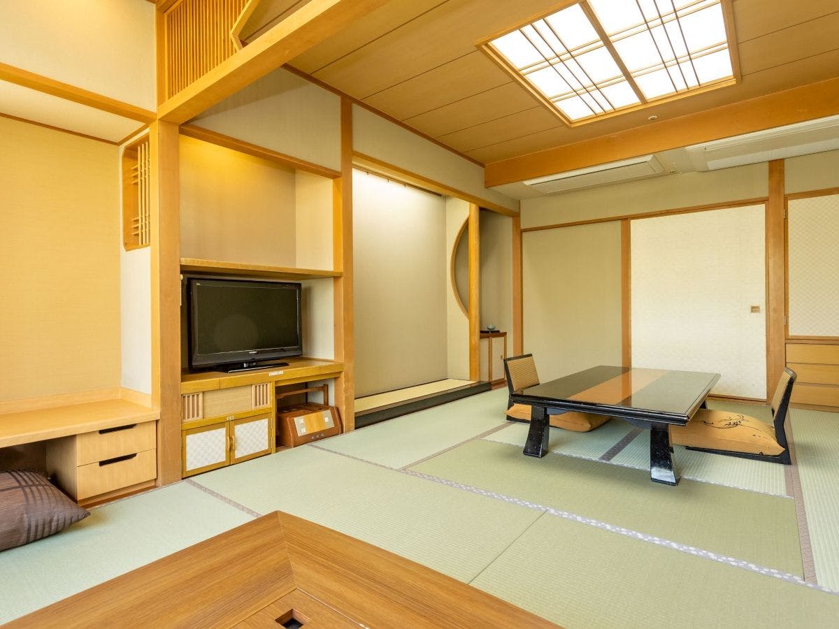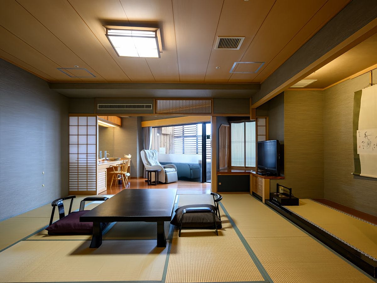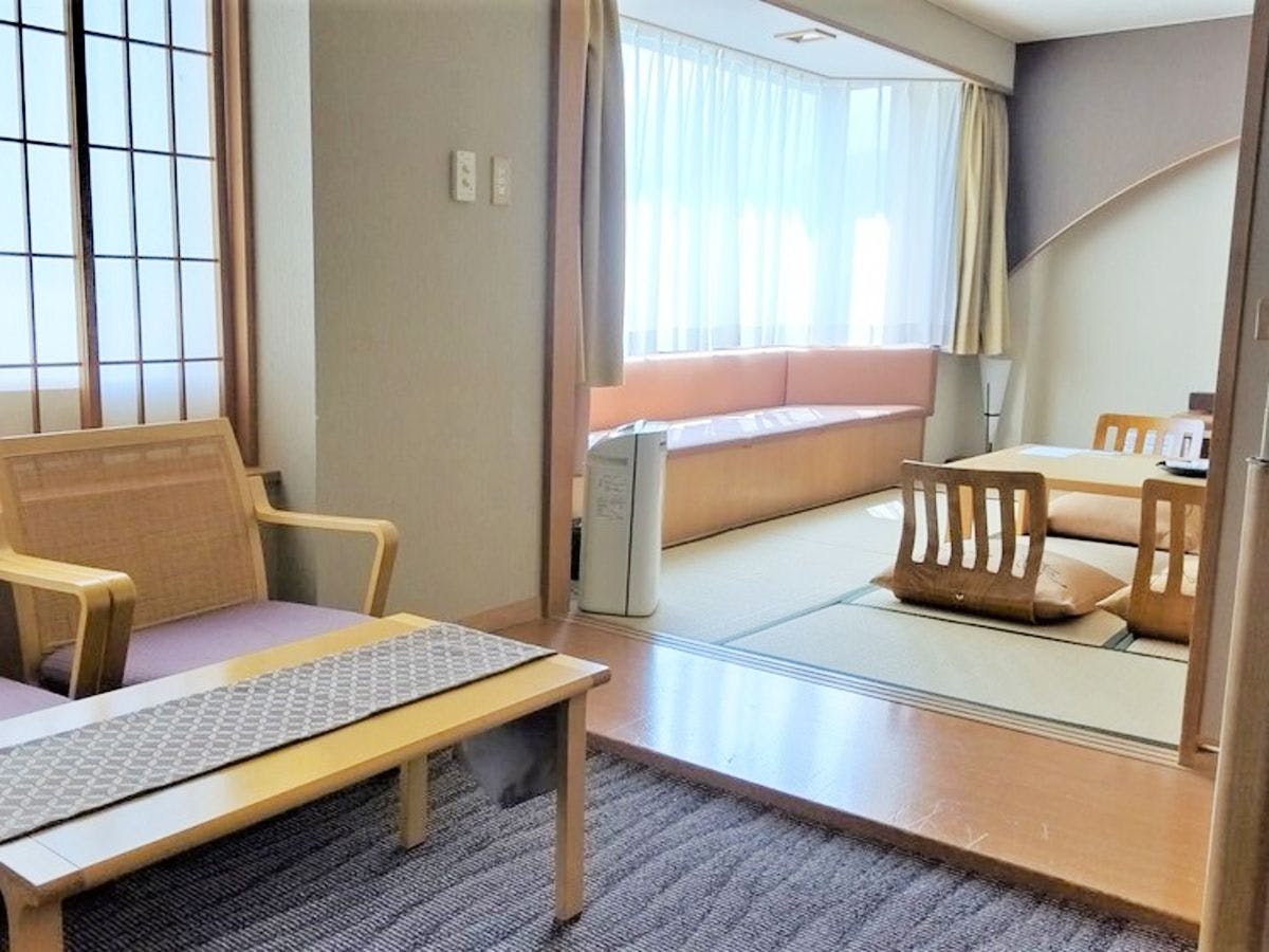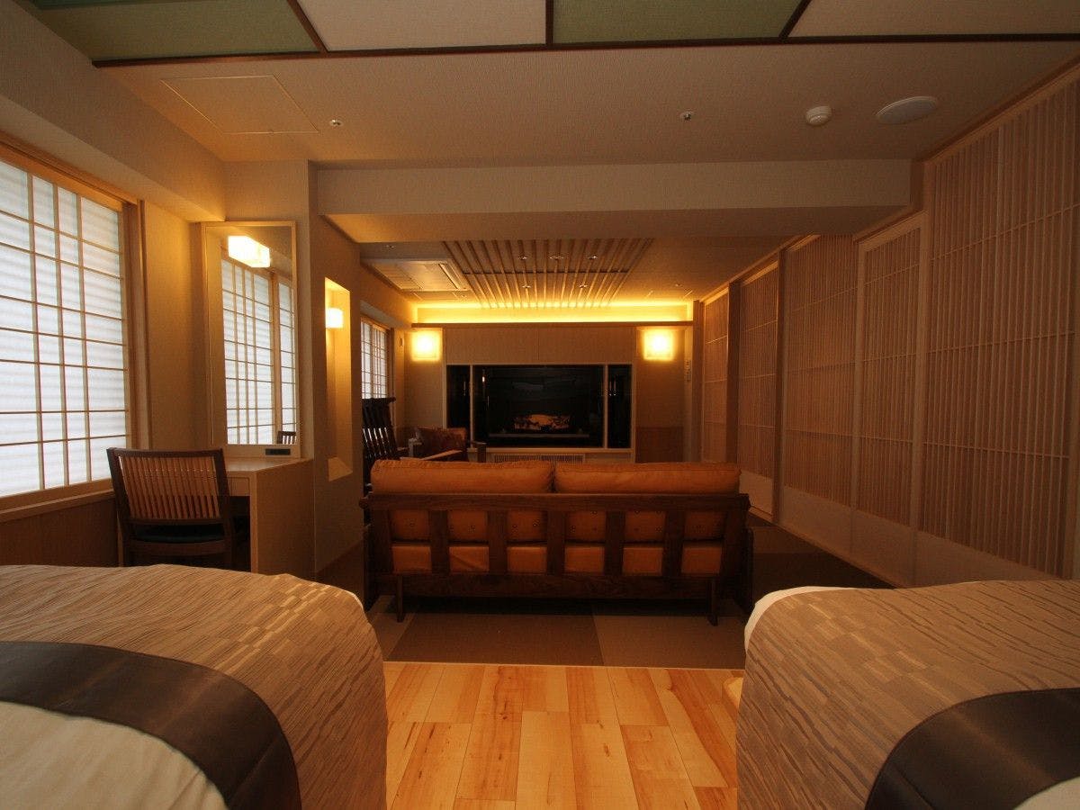 阿寒湖を望む、広々とした和洋室です。和室リビングには、マッサージチェアと大きなソファがあり、ゆったりとお寛ぎいただけます。