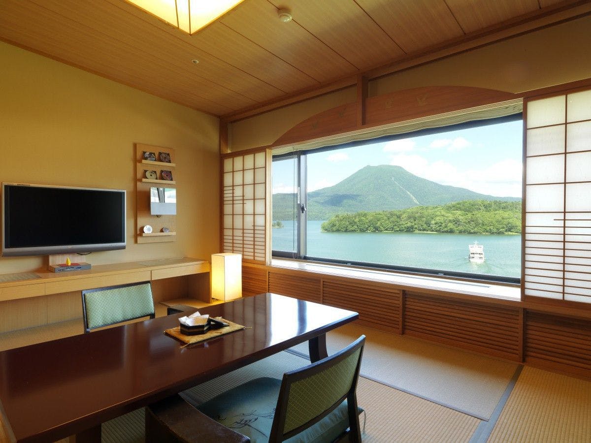 L字の窓から阿寒湖の大パノラマをお愉しみいただけるお部屋。