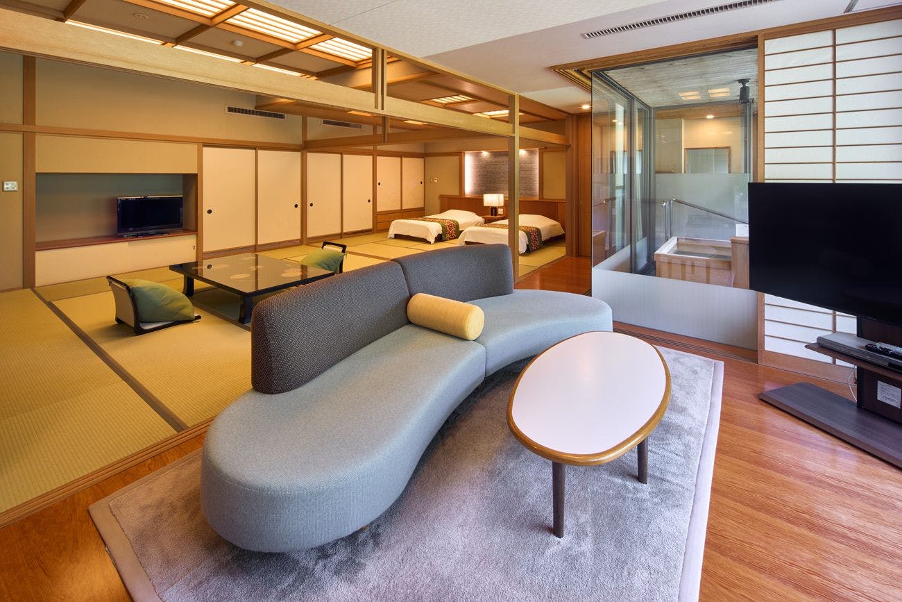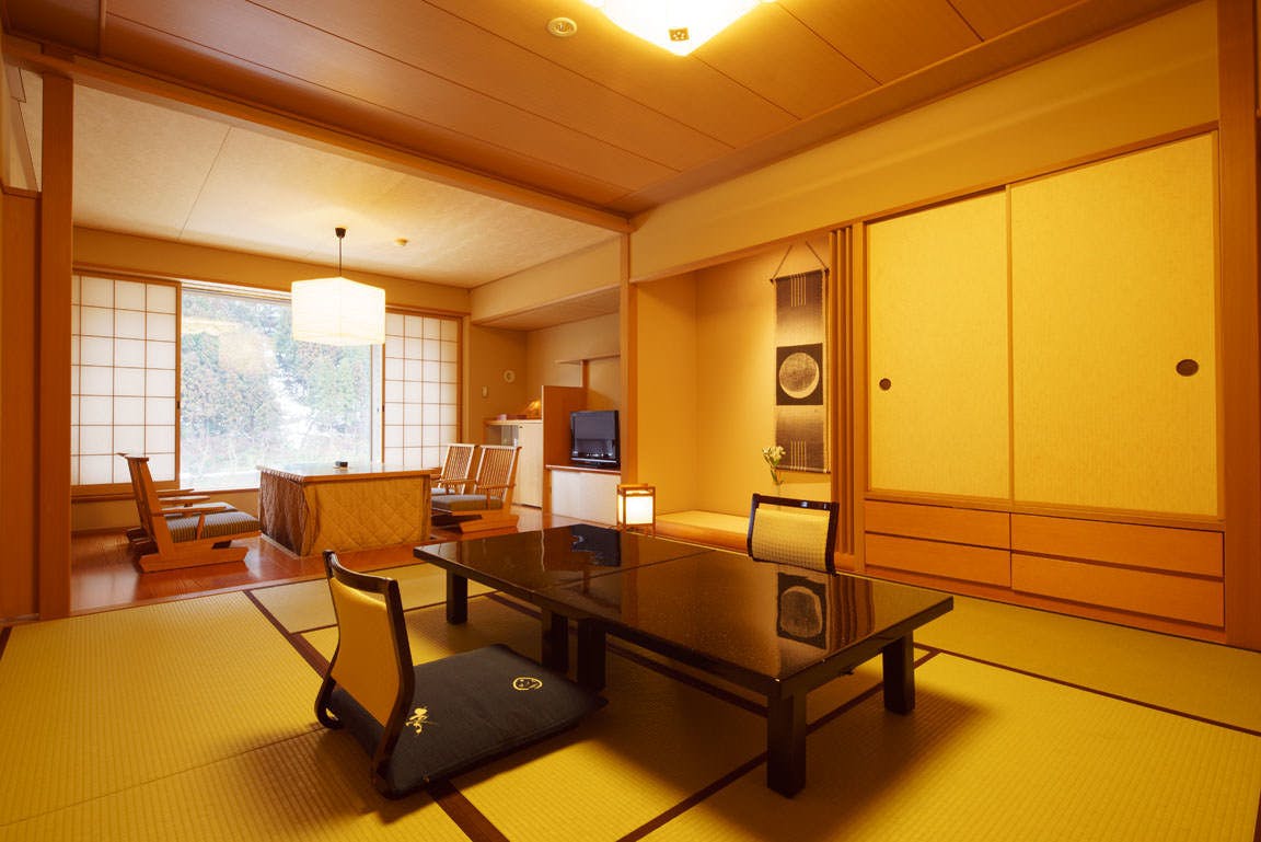 ひのき露天風呂付きの和室。広縁には、4名掛けの掘り炬燵をご用意しております。春から秋は、川のせせらぎを感じながら涼しく・・・冬は足をのばして暖かくお過ごしください。※お部屋の露天風呂は、温泉ではございません。