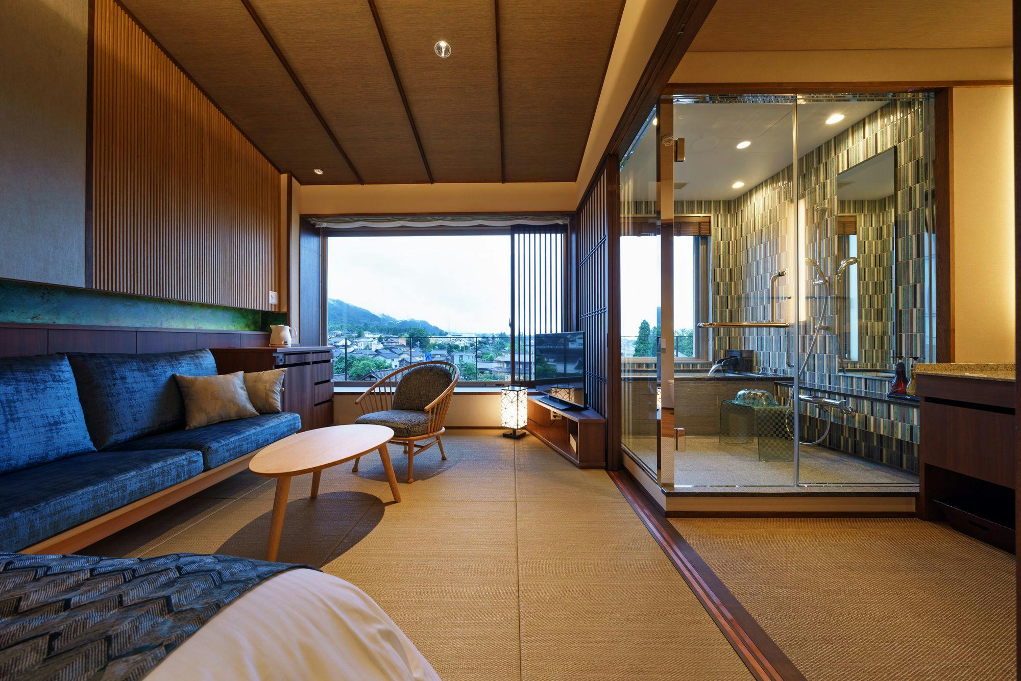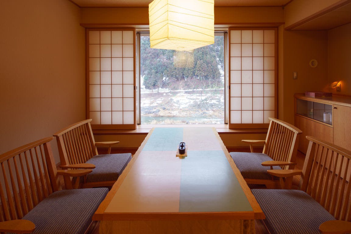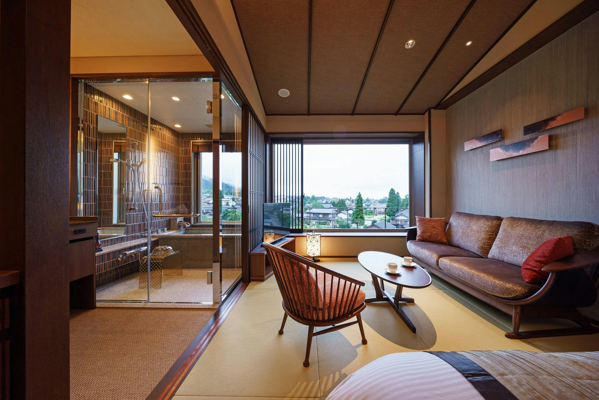 和空間の粋を大切にしながら壁紙や照明などでお部屋の雰囲気をモダンに演出。地元の伝統文化が空間に彩を添える。解放的なビューが自慢のお風呂からは、庄川の町並みが一望できます。