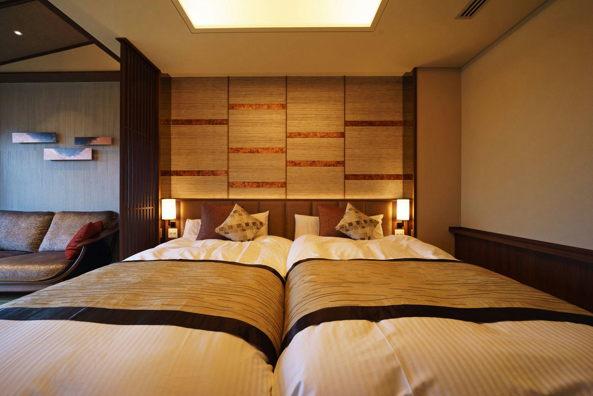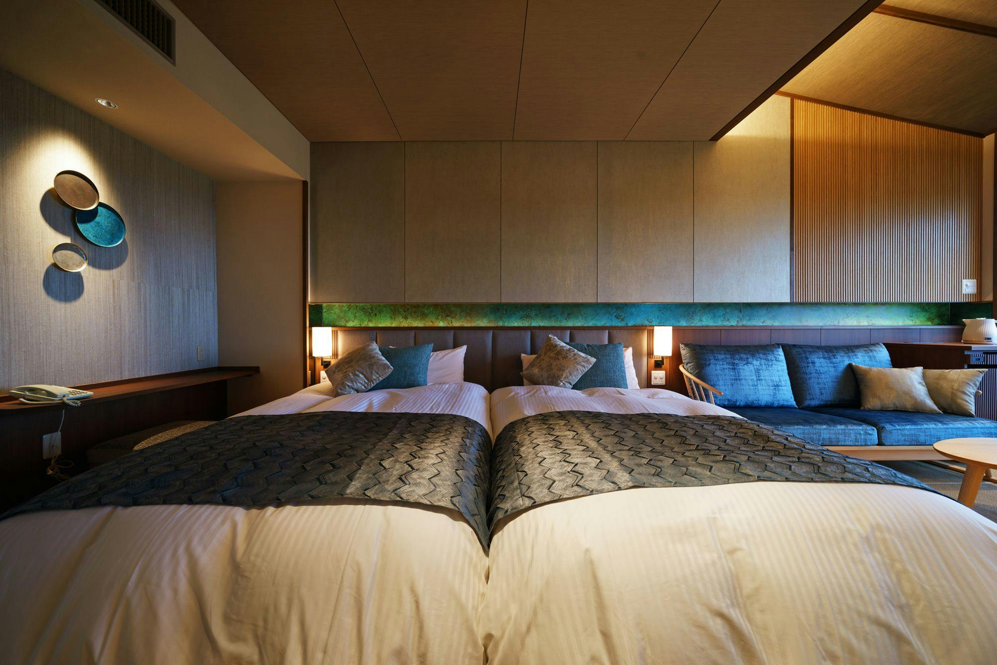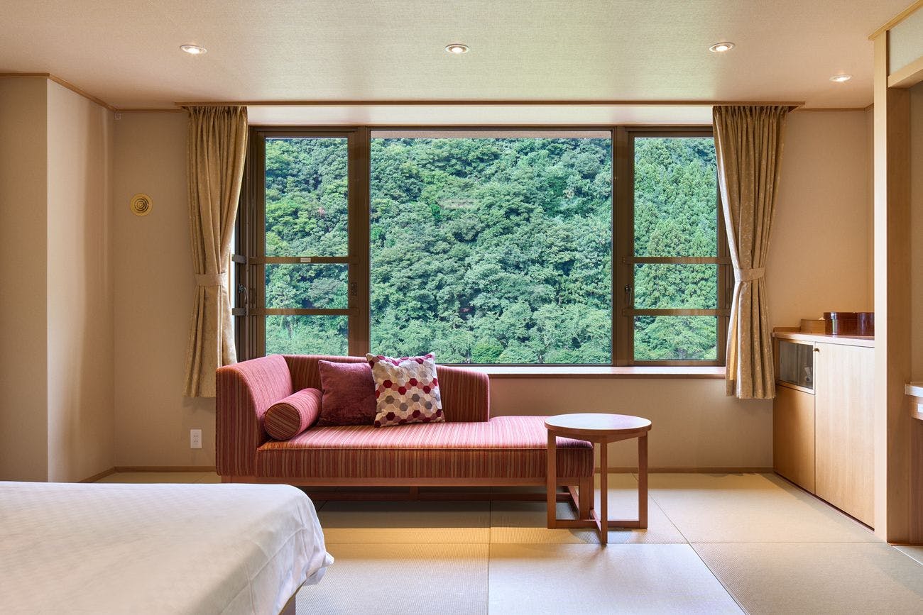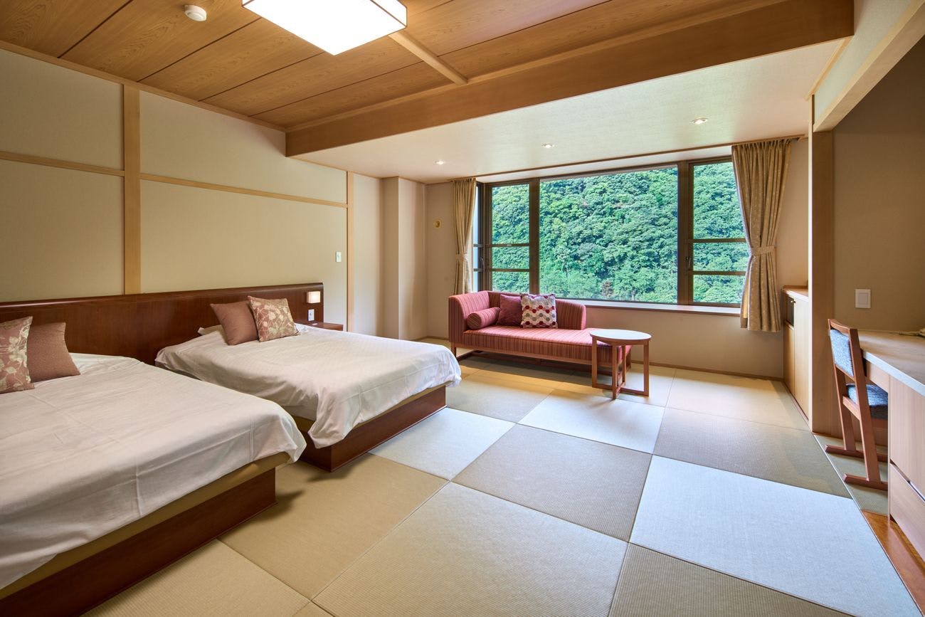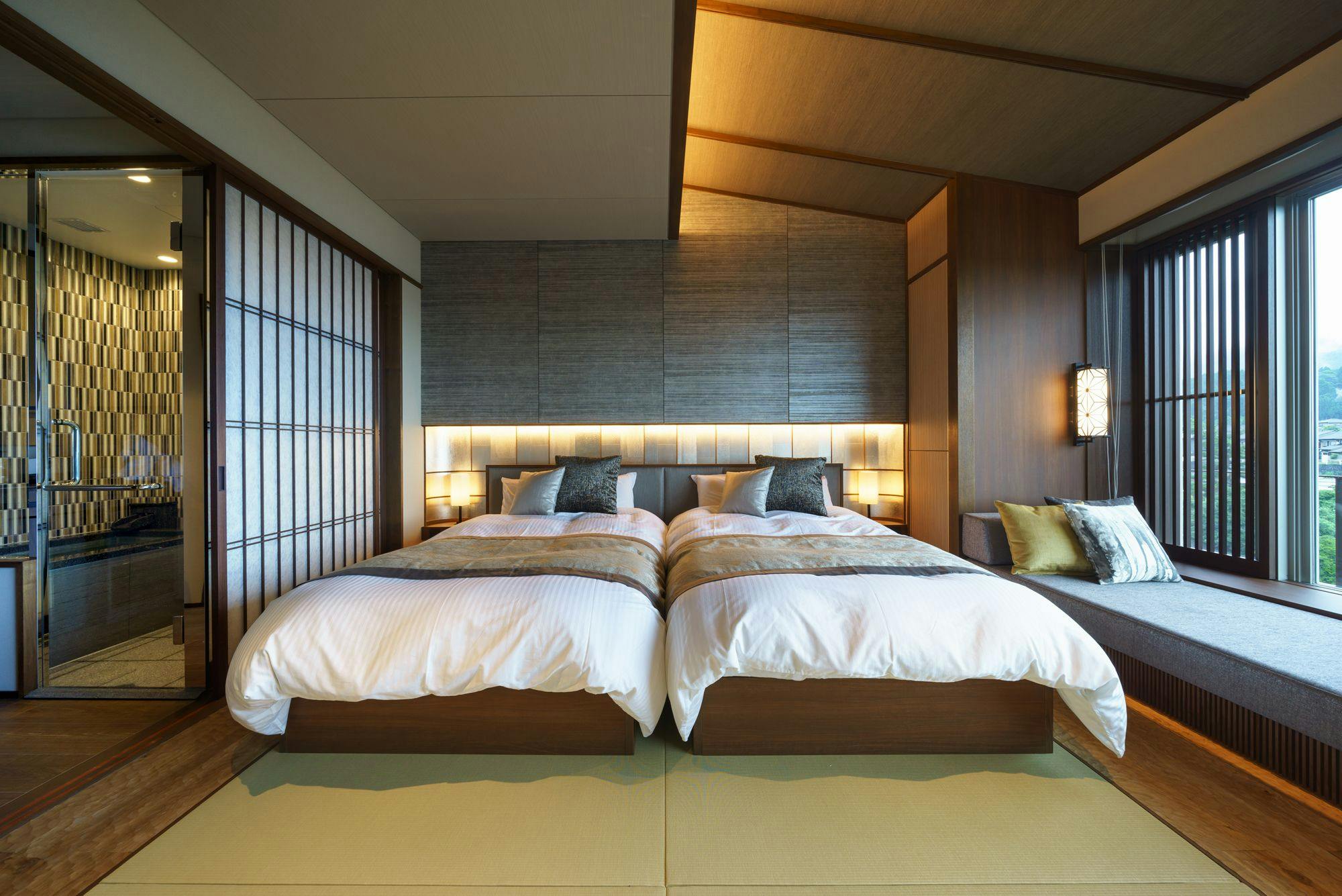 ツインベッドに加え、2名様まで布団利用が可能な広々とした開放的な和モダン空間。大開口の窓からは、庄川の町並みや八乙女山~医王山まで望めます。
