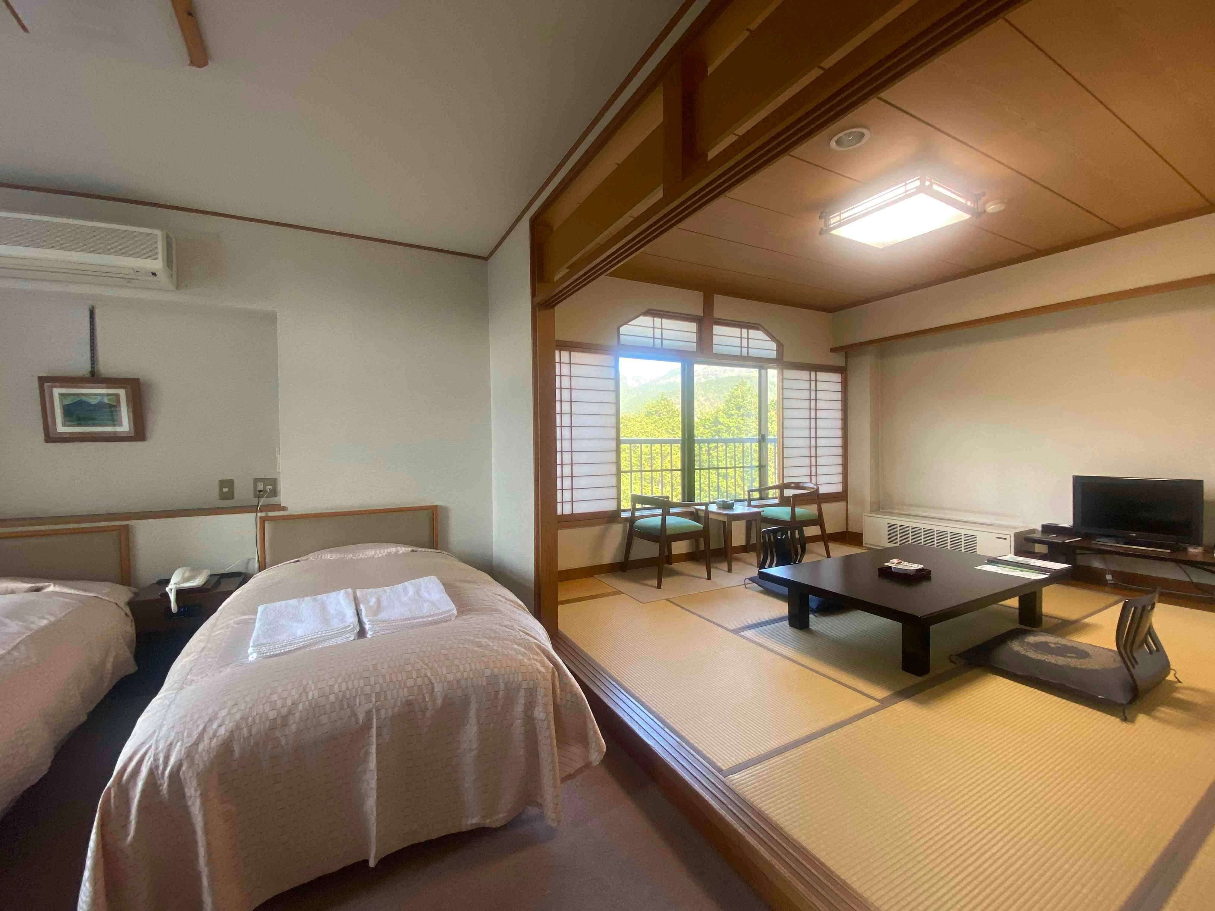 ツインのベッドと、6帖ほどの和室がセットになった和洋折衷タイプのお部屋です。