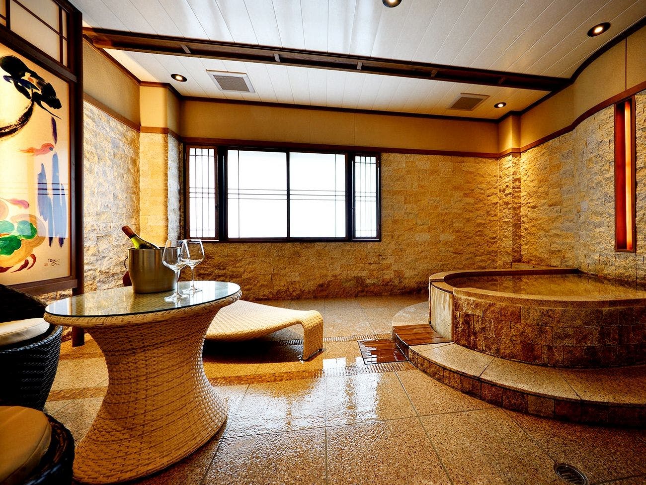 ジェットバス付きの広々とした専用バスルームは、リクライニングベッドとテーブルセットを備えた優雅な空間です。