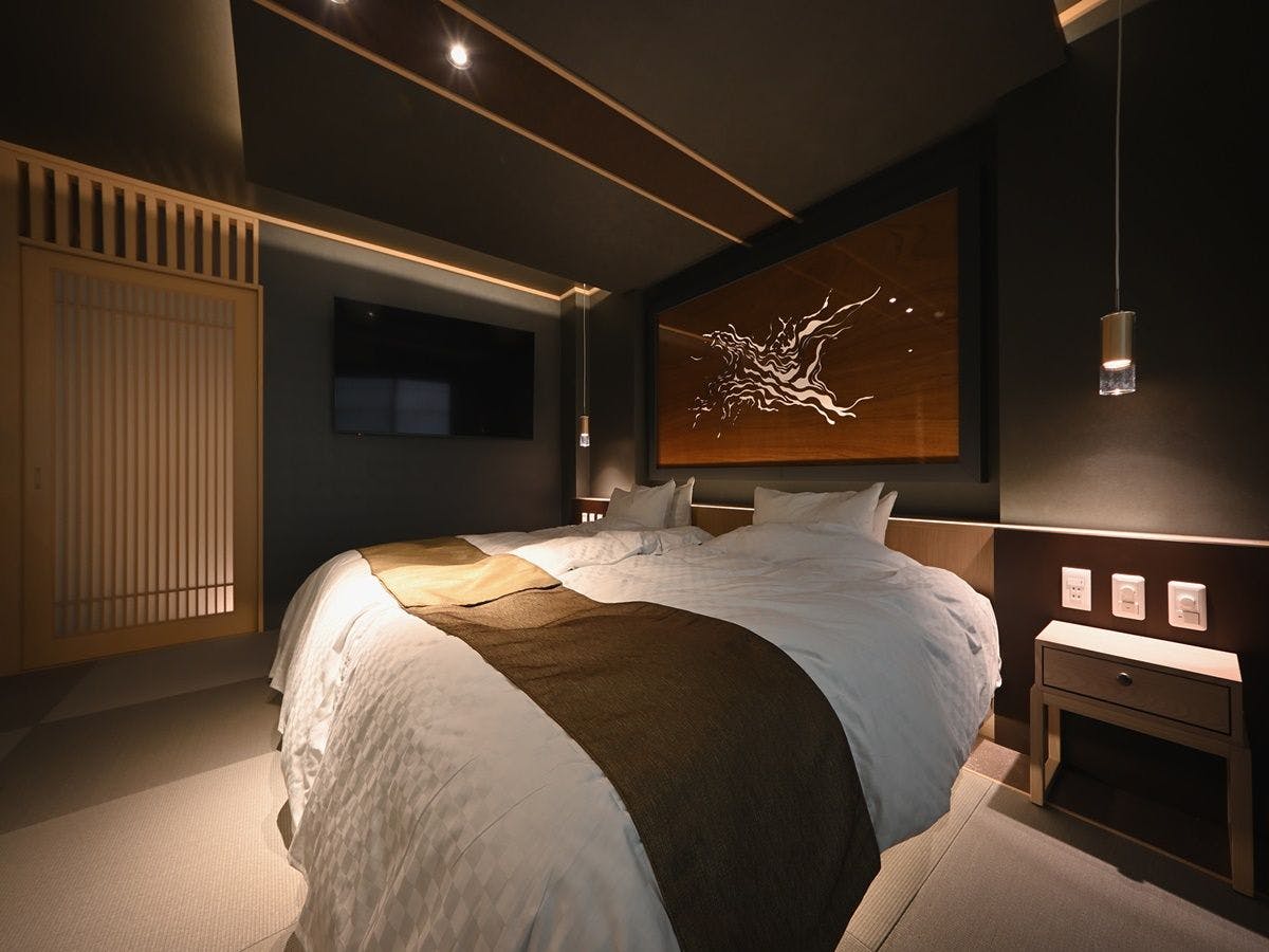 素足に心地良い畳のフロアには、大型サイズのシモンズ製ツインベッド。ゆったりとした洗面スペースや、65インチの大型TVも備えた滞在型のお部屋です。