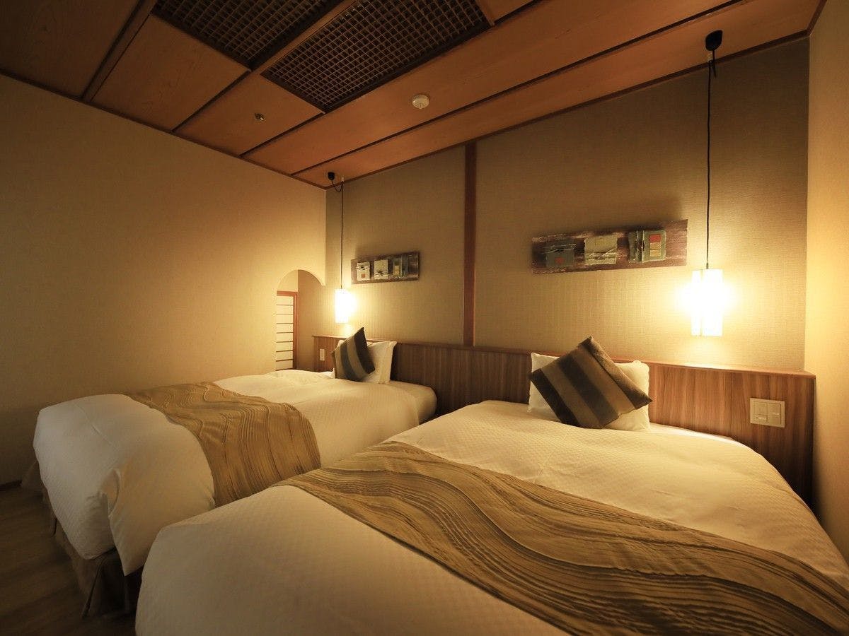 和室12.5畳+ツインベッドのゆったり寛げるお部屋で、ごゆっくりお寛ぎくださいませ。