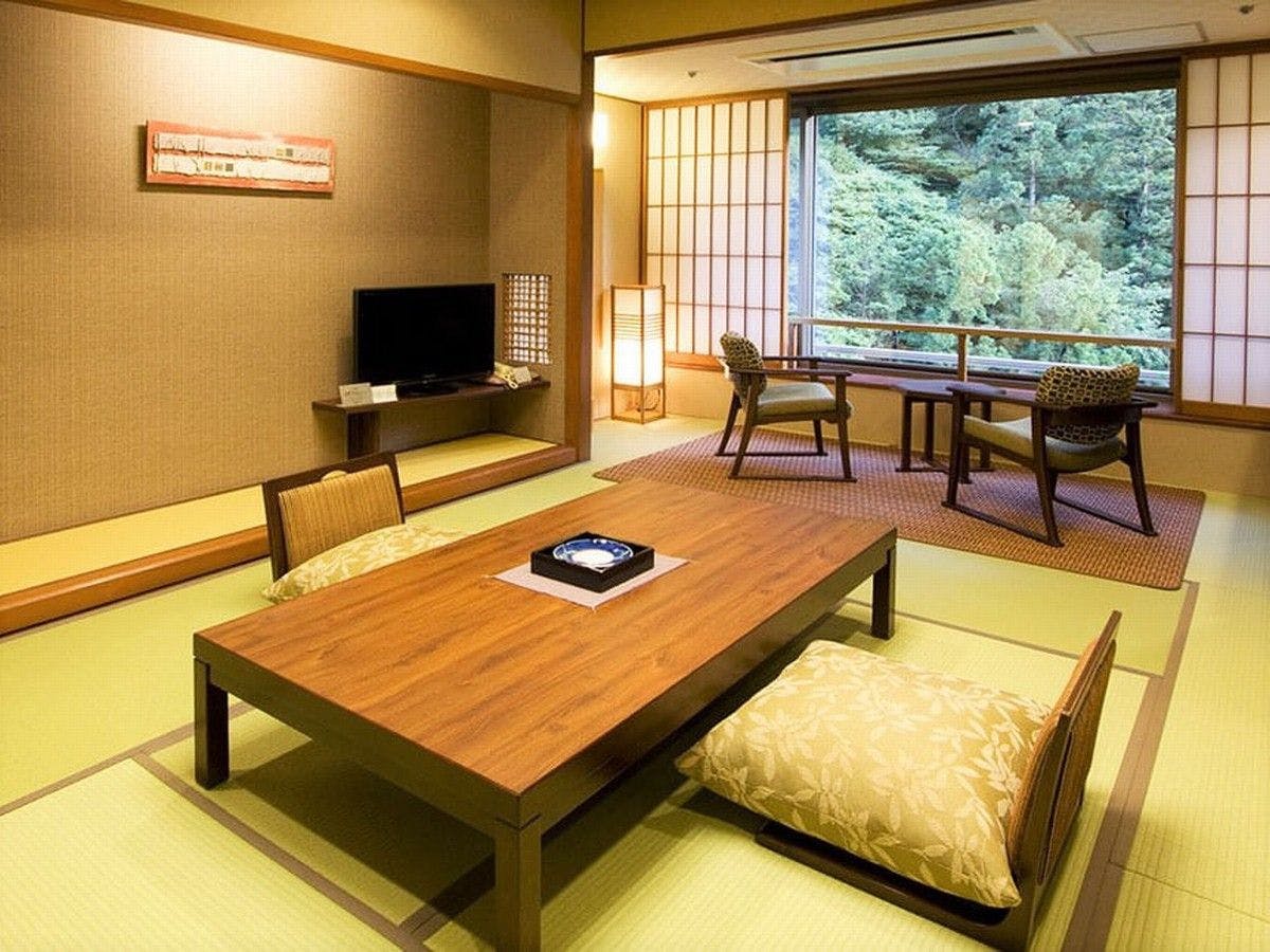 源泉かけ流し檜の内湯付きの和室で、あつみの四季を感じられるゆったりとしたお部屋です。