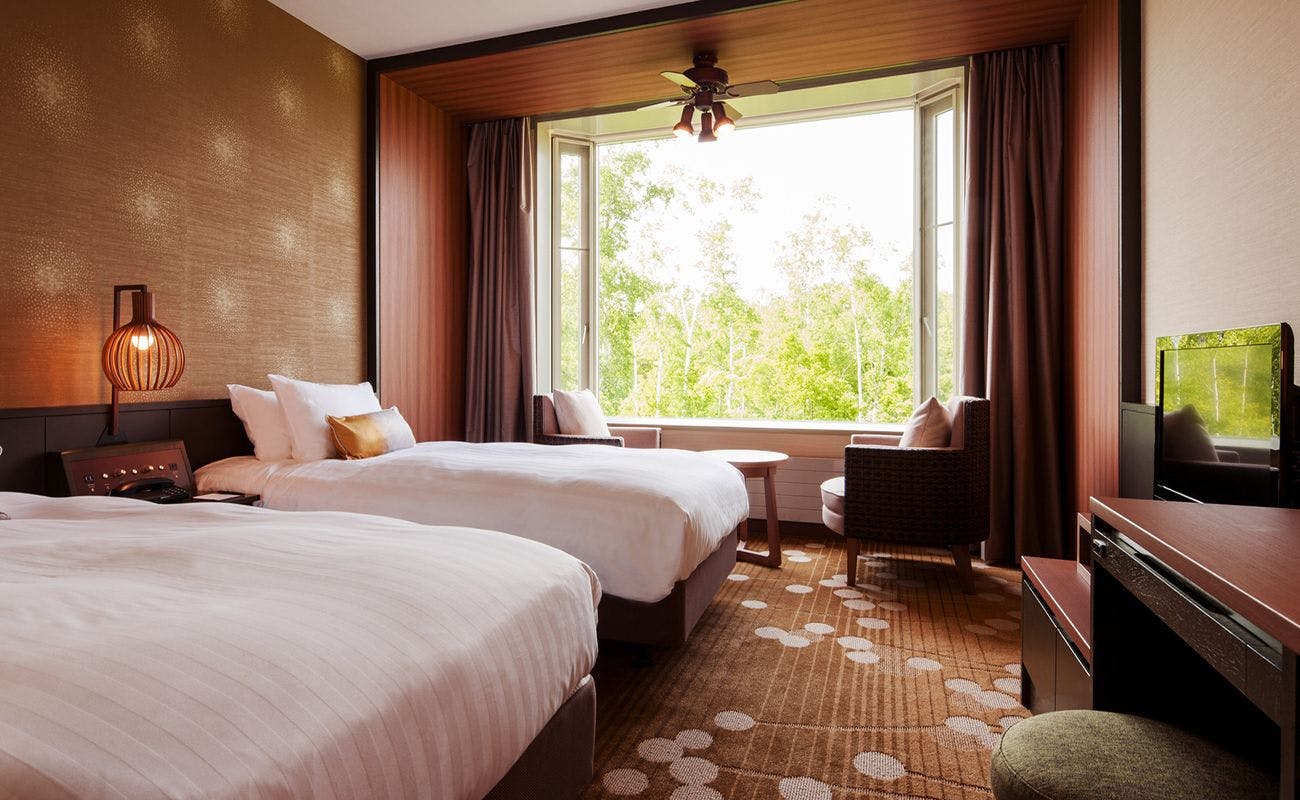 大きな窓から雄大な森を望む癒しのツインルームで