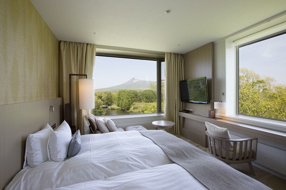大きな窓から雄大な森を望むお部屋で、安らぎと寛ぎのひと時をお過ごしください。