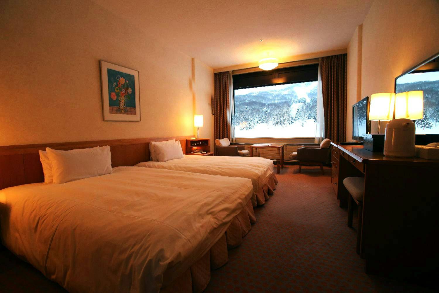 ゲレンデ側に面したツインルームB。ベッド2台とソファーベッド1台で、3名さまでご利用いただけます。洗面台が独立している機能的なレイアウトとなっております。