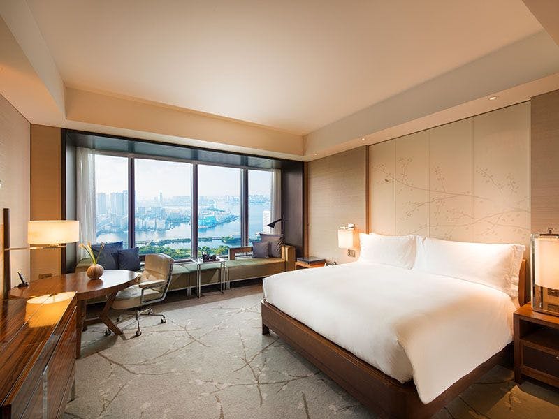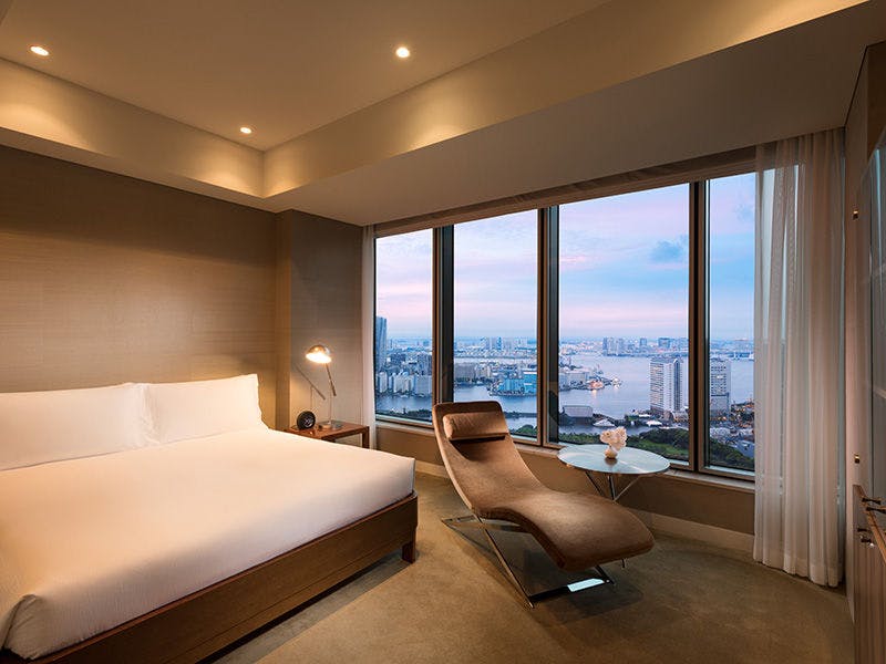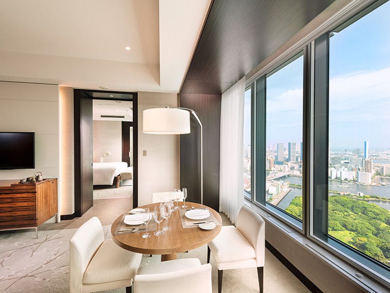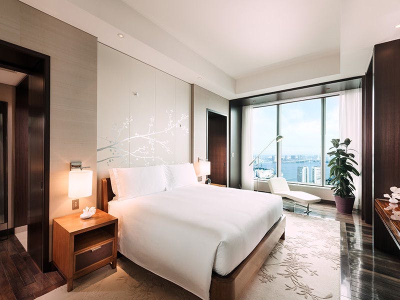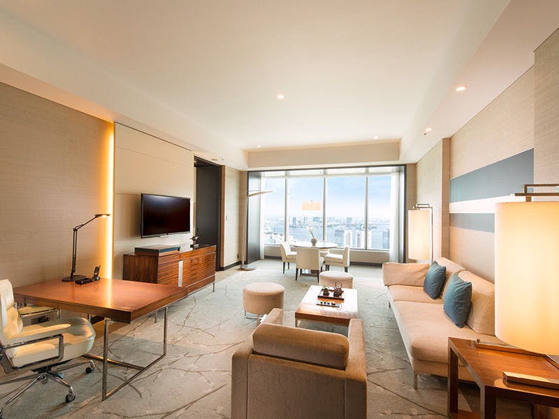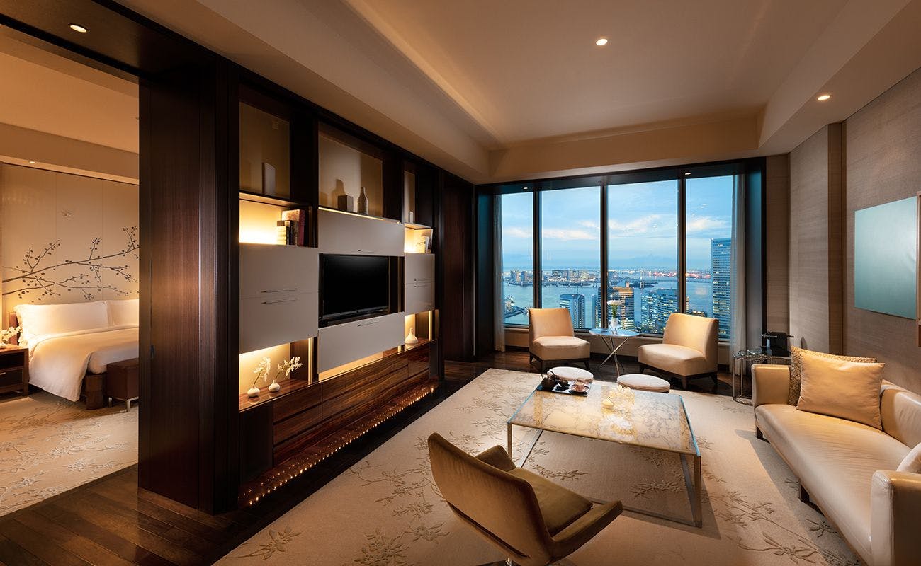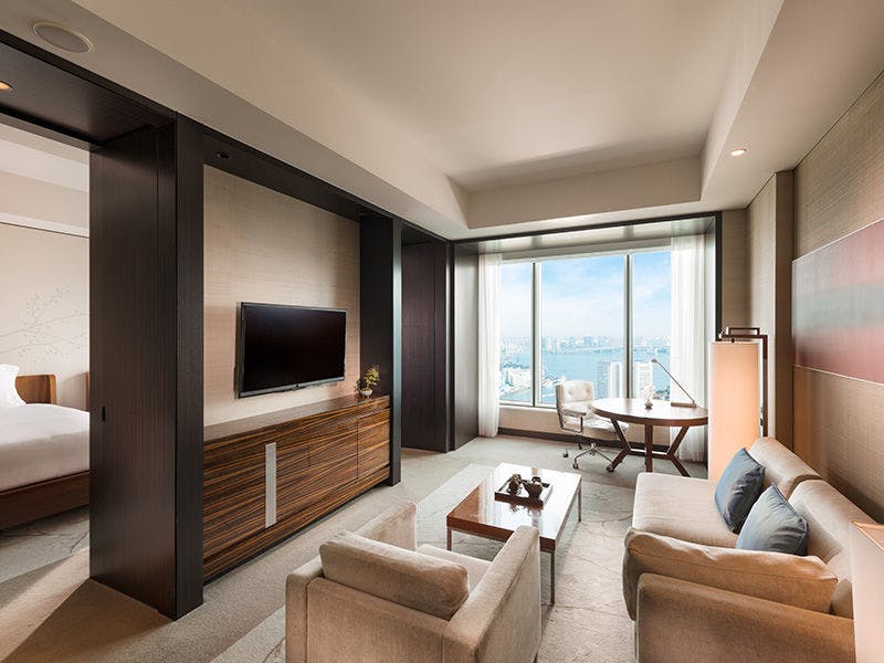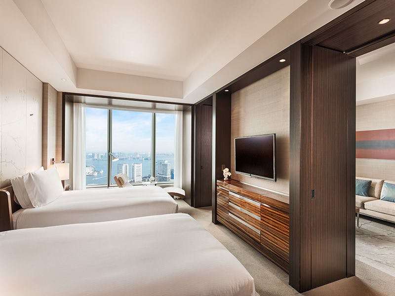 2つのベッドルームとバスルーム、リビングルーム、キッチン、ダイニングエリア、ランドリー、ドレッシングルームからなる贅沢な空間。客室からは東京湾と浜離宮恩賜庭園が一望できます。プライベートチェックイン、朝食、カクテルにはエグゼクティブラウンジをご利用いただけます。