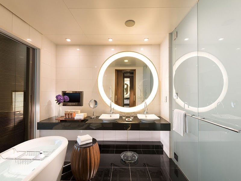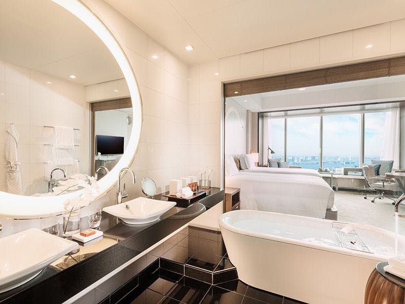 2つのベッドルーム、リビングルーム、ダイニングエリア、ドレッシングルームからなる贅沢な空間。全面ガラス張りのバスルームからも東京湾と浜離宮が一望できます。プライベートチェックイン、朝食、カクテルにはエグゼクティブラウンジをご利用いただけます。