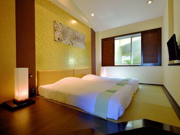 リビング側にベッド2台と、和室にマットレスを設置した、最大定員4名の和洋モダンタイプのお部屋。小さなお子様連れでも、グループお友達通しでもご利用しやすいお部屋タイプとなっております。