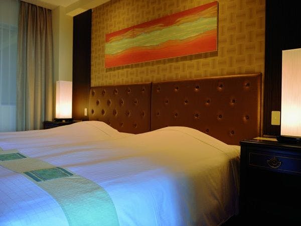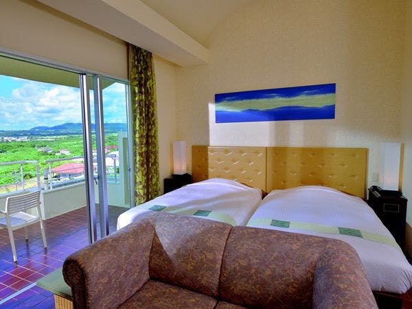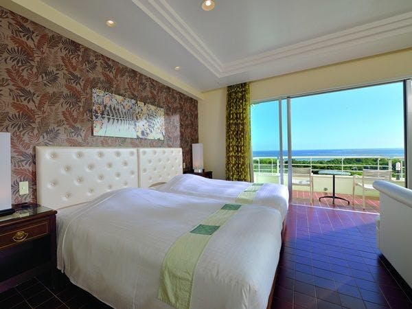 プレミアムデラックスツイン、シックに落ち着いた空間となっております。全室オーシャンビュー ツインベッドタイプ