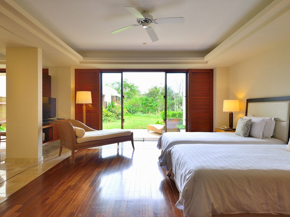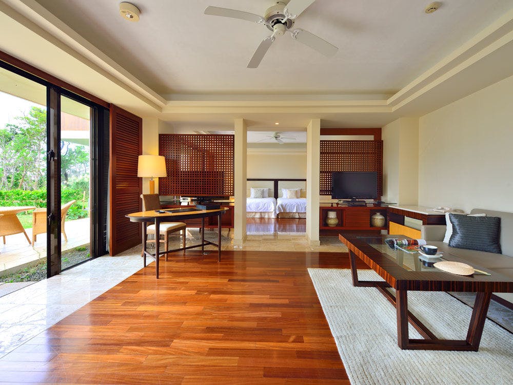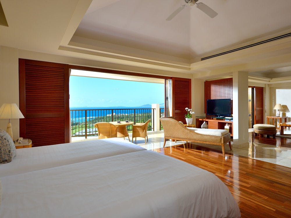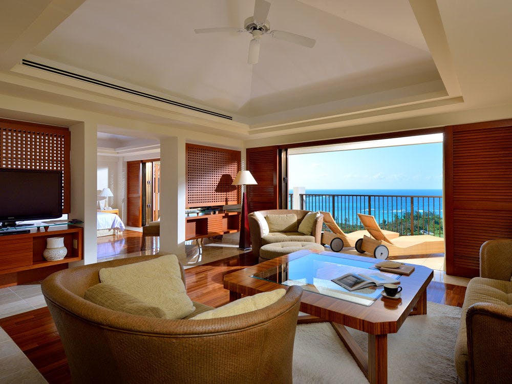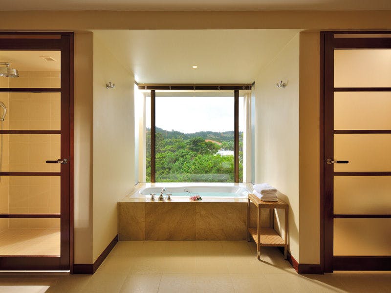 大きな窓とテラスを設え、3方向から光が差し込む、57平米の広々としたコーナールーム。緑豊かな森やガーデン、光り輝く東シナ海をご覧いただけます。また、朝のお支度等にも便利なダブルシンクの洗面台を設けており、居住性の高いお部屋です。