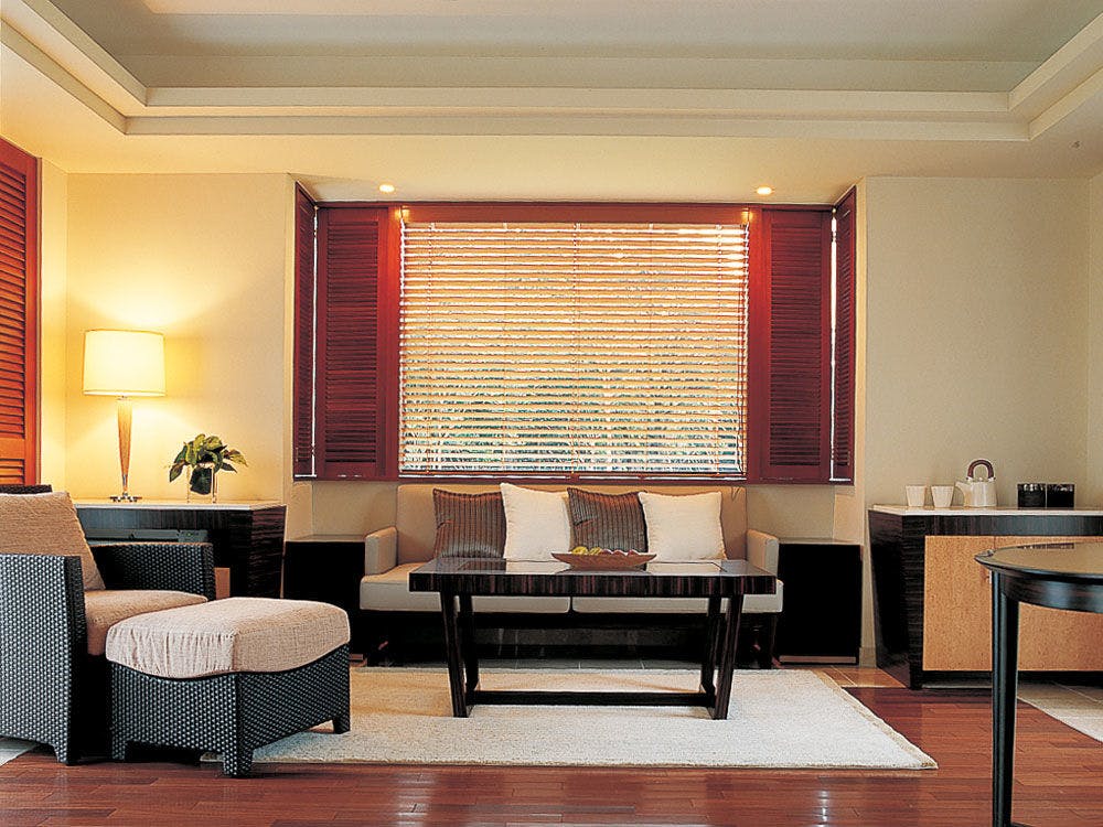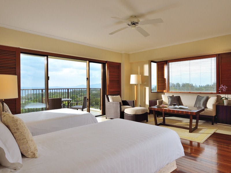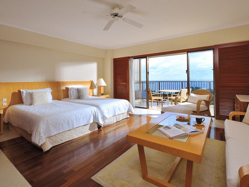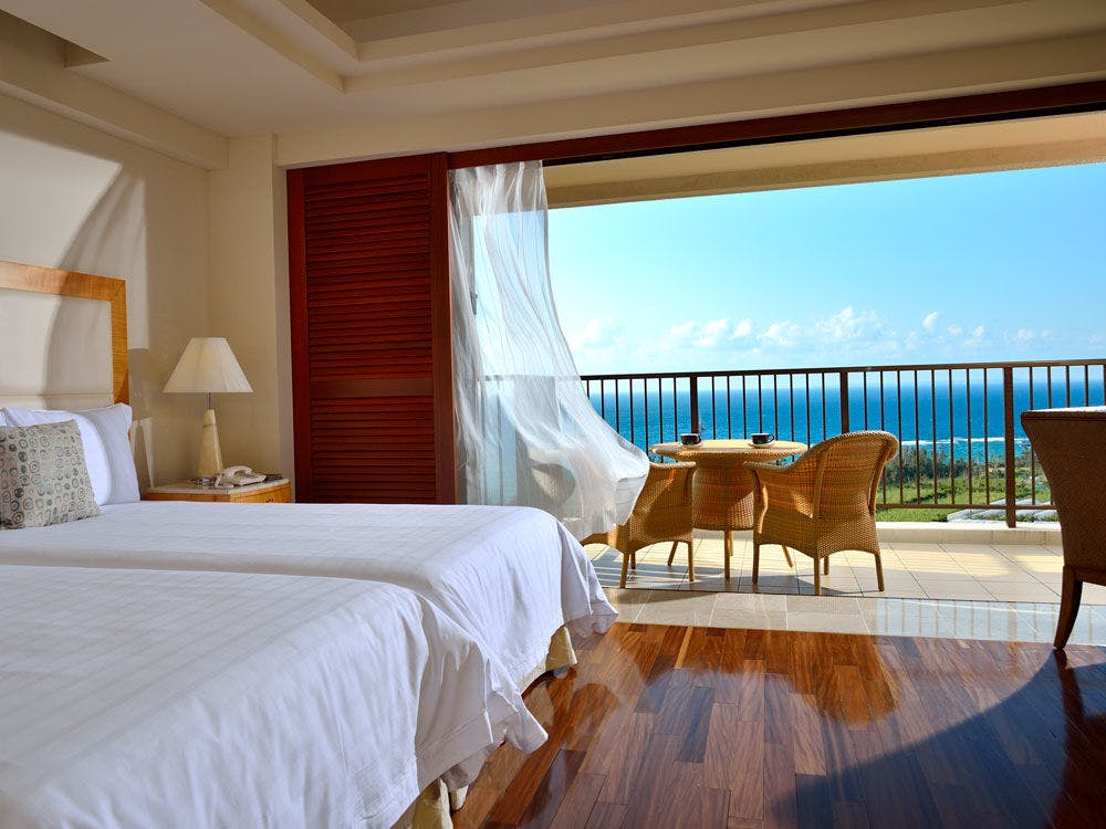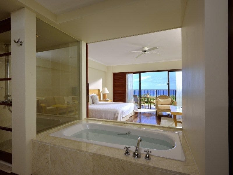 大きな窓とテラスを設え、3方向から光が差し込む、57平米の広々としたコーナールーム。緑豊かな森やガーデン、光り輝く東シナ海をご覧いただけます。また、朝のお支度等にも便利なダブルシンクの洗面台を設けており、居住性の高いお部屋です。