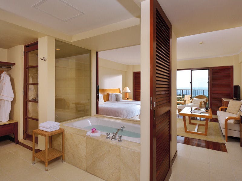 ベッドルームとバスルームの境を取り払い、開放感と明るさ、ゆとりの広さを提供。バスルームのスライドドアを大きく開けば、バスタブからベッド越しに光輝く東シナ海や、美しい夕景が臨めるデラックスルームです。