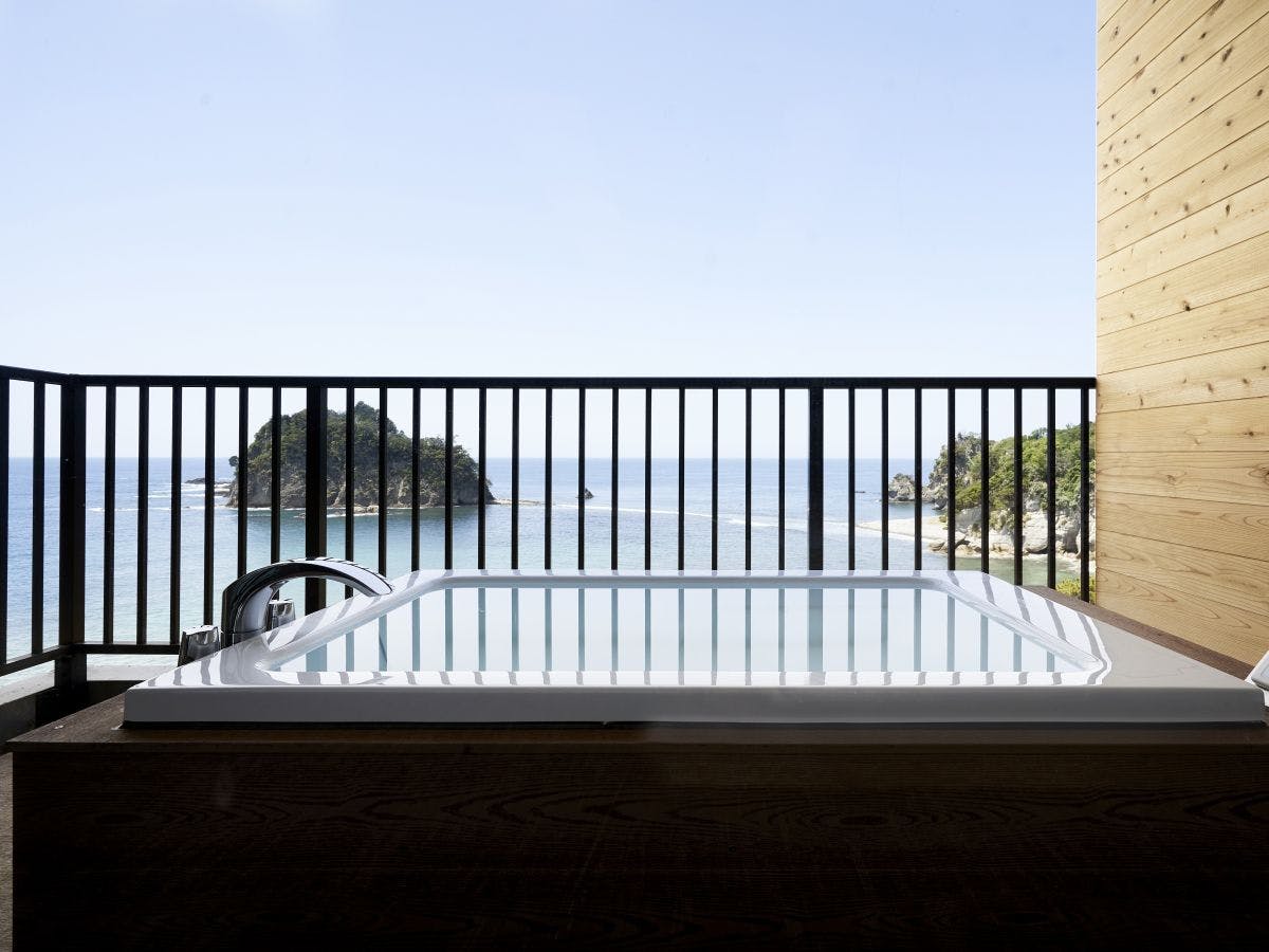 テラスの露天風呂からは西伊豆の海と三四郎島、そして夕陽を望む事ができます。客室の露天風呂では、